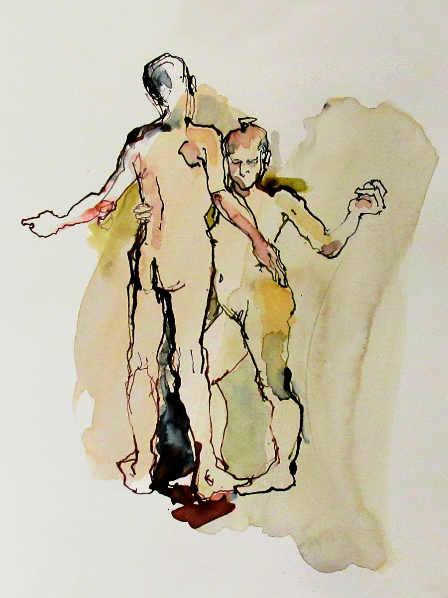 We opened with a 10-minute pose standing side-by-side facing in opposite directions with arms out. Next for 15-minutes Esther was standing while I sat embracing her left leg – it’s a pose we’ve used several times as it switches our relative heights. The last pose of the first half saw us seated face-to-face on the floor. There was some contact between our limbs, but this one was more about eye contact and emotional contact.