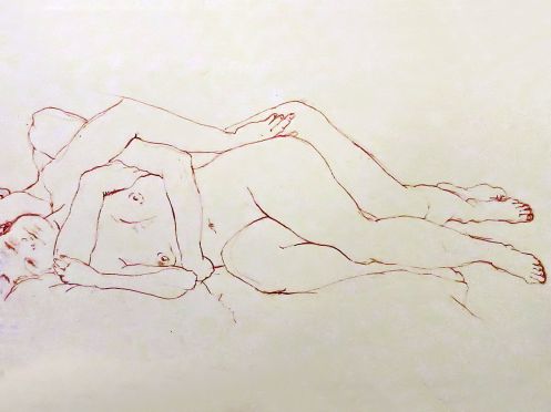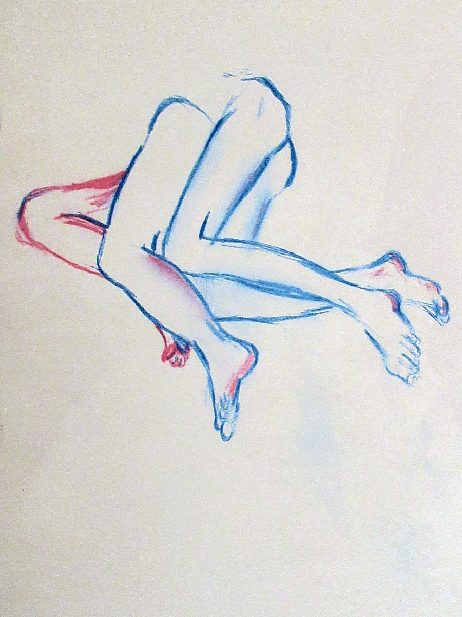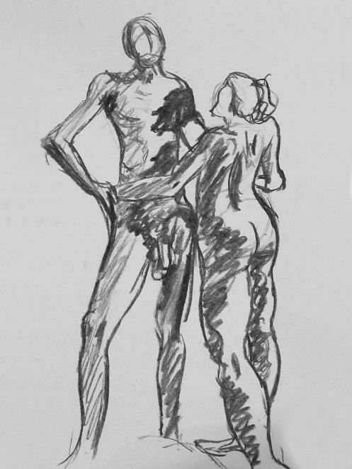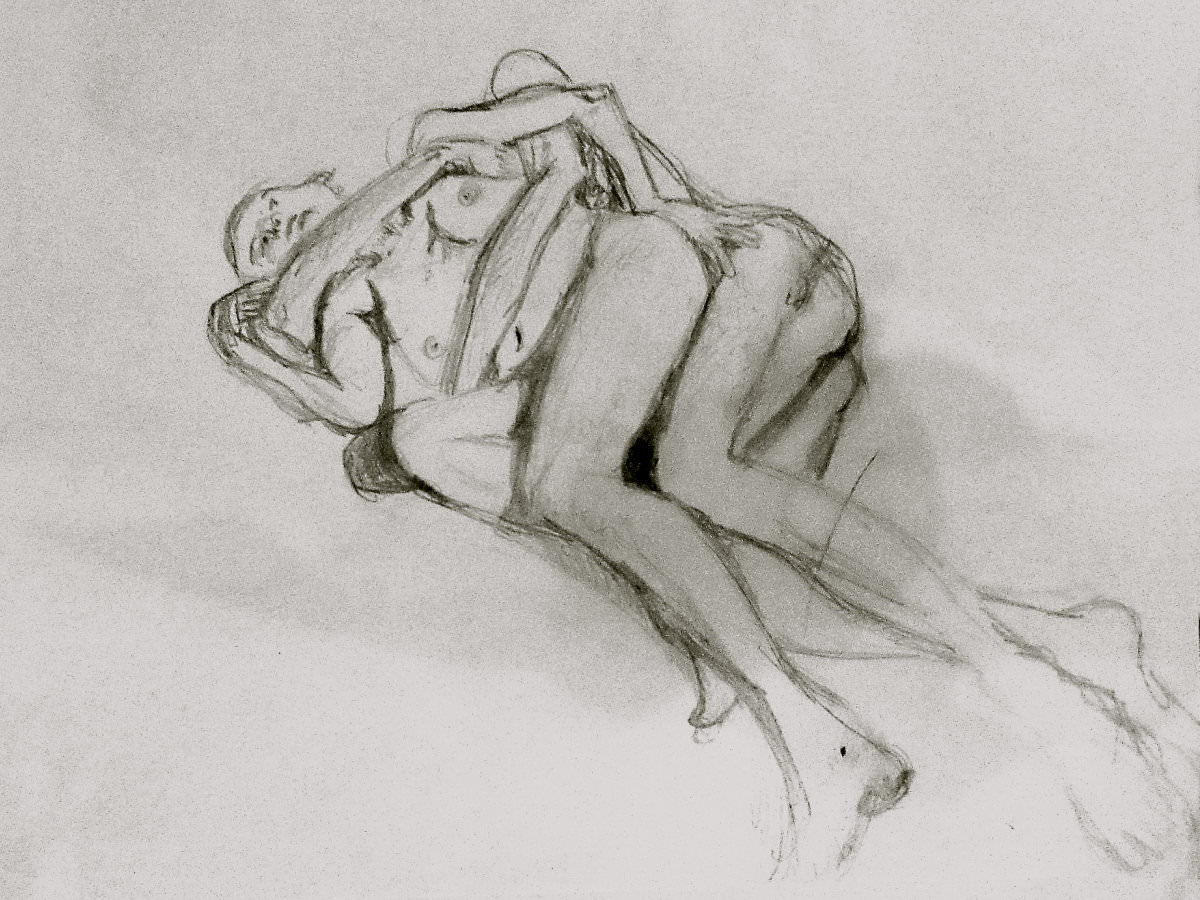 After a break for refreshments, we curled together in a reclining spooning embrace of 40-minutes. It may seem self-indulgently lazy, to lay down half-asleep for what would be our longest pose of the evening, but actually we chose this as it guaranteed every artist would have a clear view of both bodies and the composition provided. Plus, this was indeed a ‘couple’ pose – more than a duo pose.