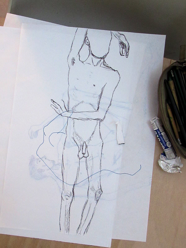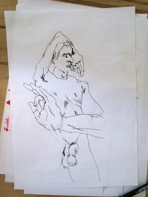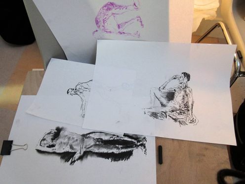 It seemed such a tiny room at The Green in Nunhead; just 12′ by 15′, supposedly for a capacity of ten, yet by the end of the evening I was posing with my back to the wall for 13 artists. Nunhead Drawing Group is young in all respects – I believe this may have been only their eighth session – and with its freshness comes friendliness and a willingness to accommodate. Cushions had been heaped in one corner for me and, at 7pm, I disrobed to commence what would be a series of short poses.