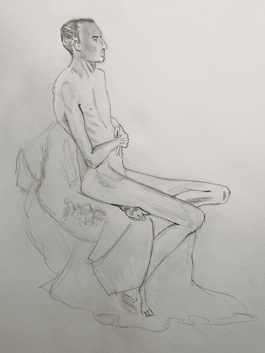 After a relatively long break of half an hour – their last natter this side of autumn – the group’s organiser, Patrick, showed me the pose he would like for our final 30-minutes: sitting on the floor with upper body rested on a chair. I know from experience that this one is guaranteed to numb the arm that hangs farthest across the chair but it has the potential to result in quite elegant artworks, so I don’t mind too much.