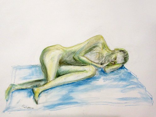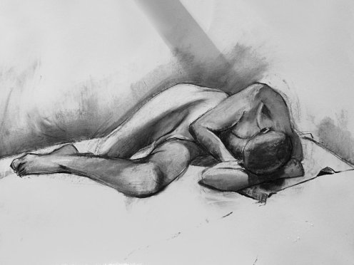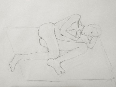 For the long pose, Victoria asked me to curl up on my side in a foetal position whilst artists stood in a semi-circle around me. I opened the pose out a little, otherwise one would see just the top of my head, and another only my derrière. It should have been very comfortable – and mostly was – except I had placed my head on my left biceps, and twisted the other hand under my chin. Two timely stretch breaks kept the aches at bay, however. At the end, it was great to see the diversity of works created.