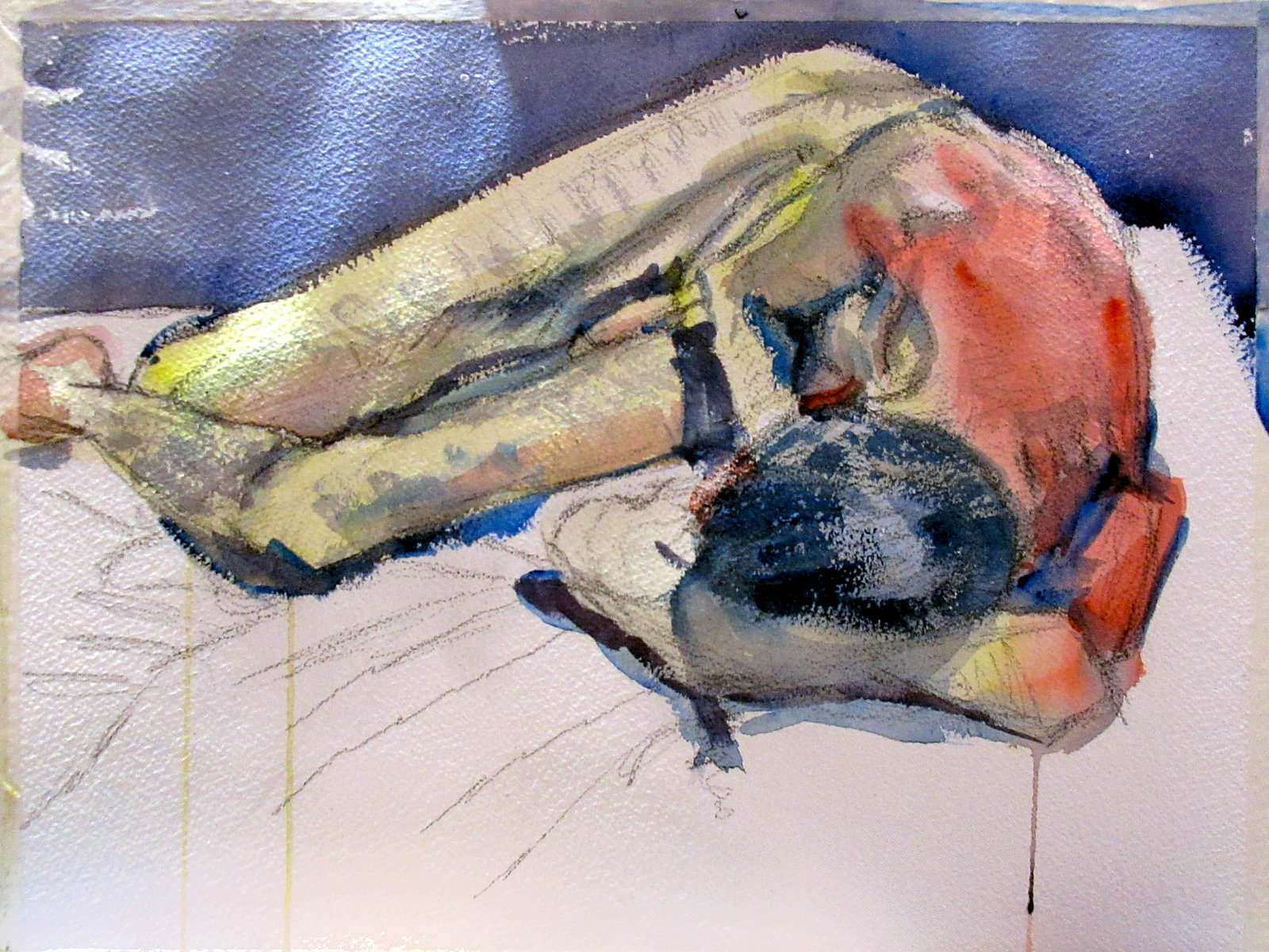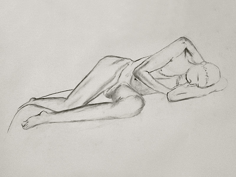 For the long pose, Victoria asked me to curl up on my side in a foetal position whilst artists stood in a semi-circle around me. I opened the pose out a little, otherwise one would see just the top of my head, and another only my derrière. It should have been very comfortable – and mostly was – except I had placed my head on my left biceps, and twisted the other hand under my chin. Two timely stretch breaks kept the aches at bay, however. At the end, it was great to see the diversity of works created.