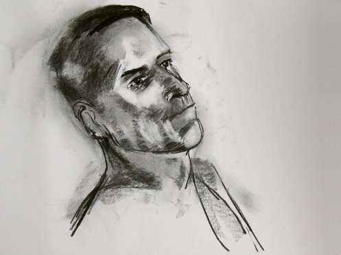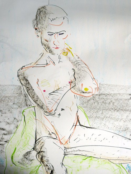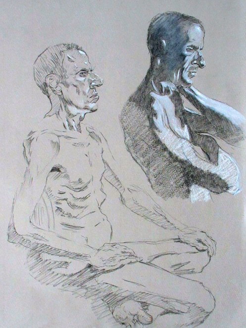 At the end of that third pose, the sweat was pouring off me. I closed the first half with another 10-minutes on the chair – now for seven artists – but this time I loosened my body to keep it cooler. A small heater in the room had been reset to blow out cold air, and I’d tilted it slightly in my favour. The price exacted for slouching and leaning back was an unpleasantly stiff neck, but some nice portrait work was the result. My nudity for most artists seemed immaterial at this point.