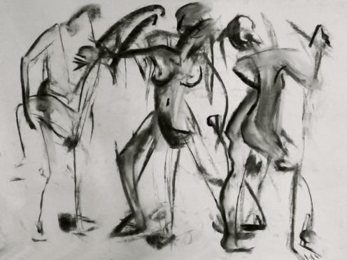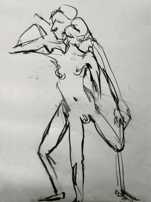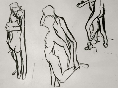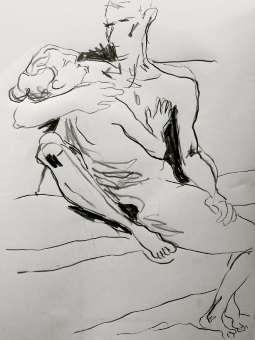 From here on, our pose times began getting longer, from 5-minutes up to half an hour. We next tackled the dubious Eric Gill, and a work which Tate Britain calls ‘Ecstasy’ but which Gill himself titled ‘Fucking’ – Esther and I embraced intimately but achieved neither state in the time available. Our third inspiration was a return to Rodin, albeit in detail only, taken from his mighty ‘Gates of Hell’ (bottom right corner).