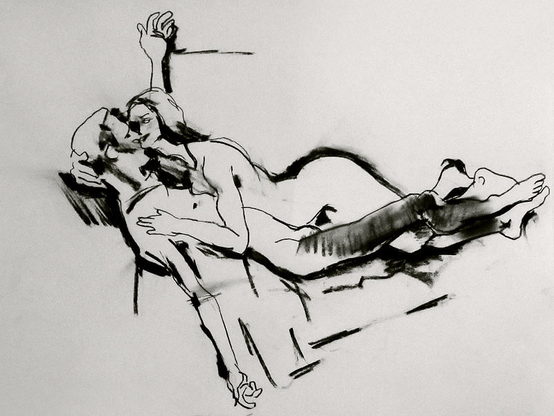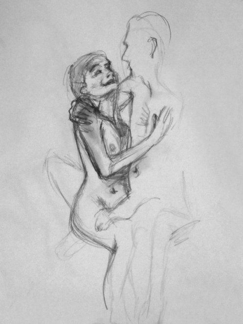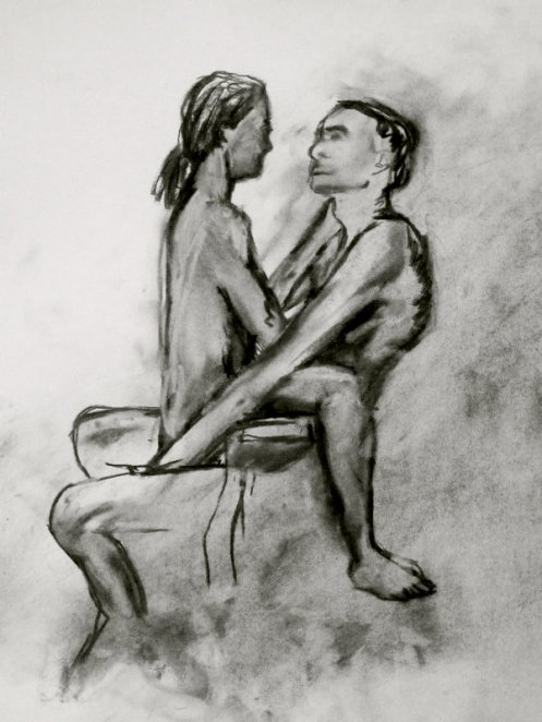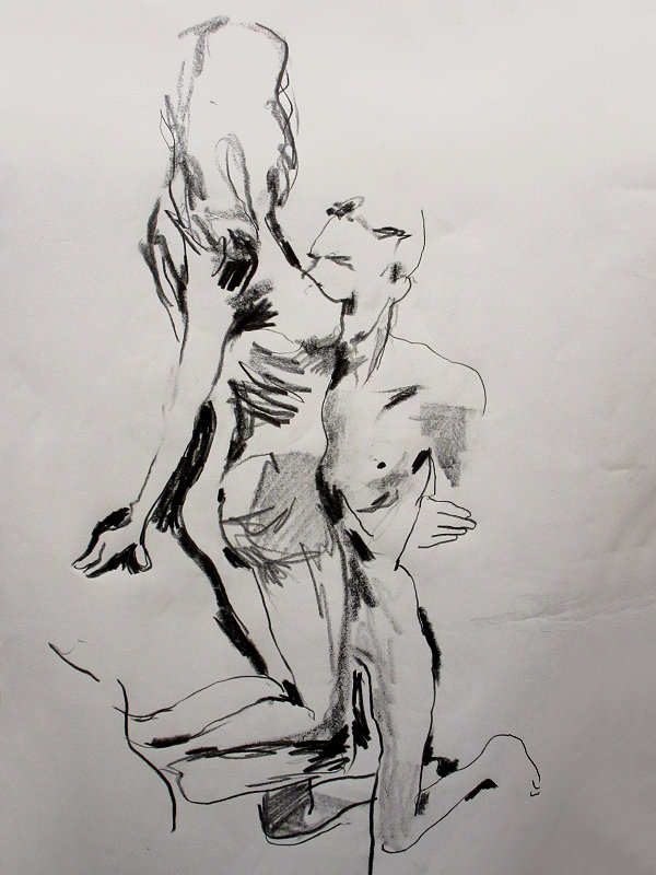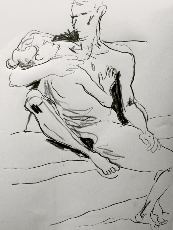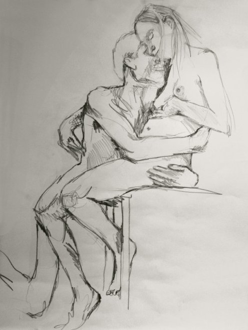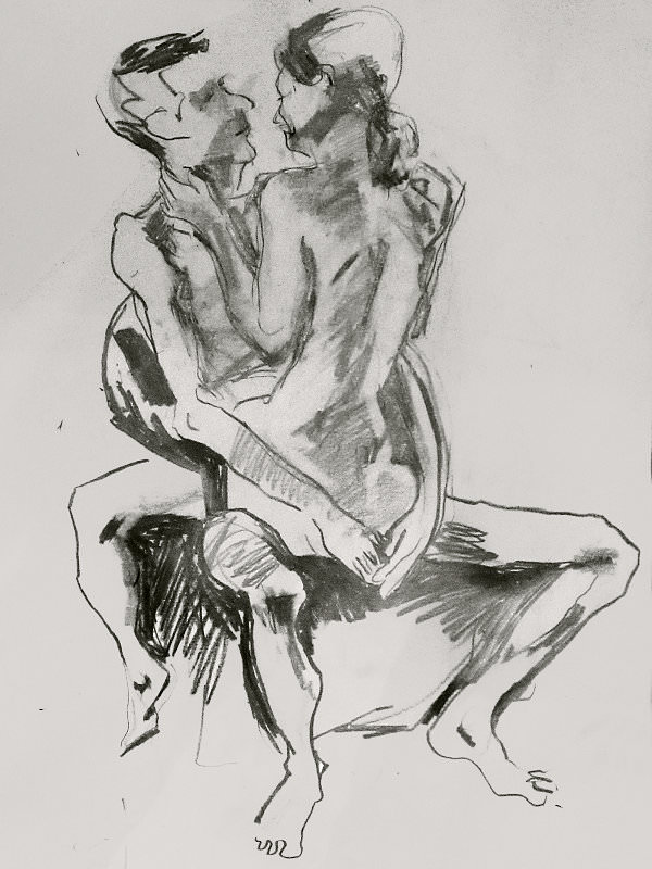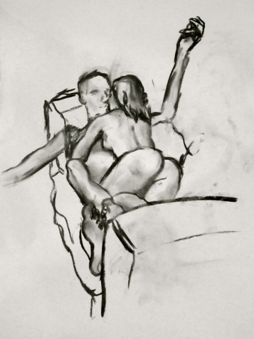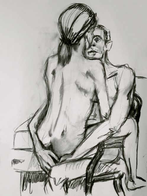 Luisa of London Drawing Group told us this was a life drawing theme she had been wanting to present for a long time. It was a feeling that both Esther and I shared; we’d modelled as a duo for many sessions, yet ‘Art of Love’ would at last give us licence to pose truly as a couple. Luisa sent us images of ten great artworks that she would like us to interpret, so we practised before walking to Buster Mantis in Deptford.