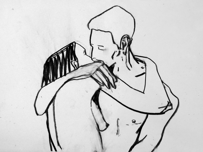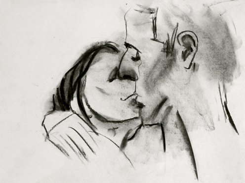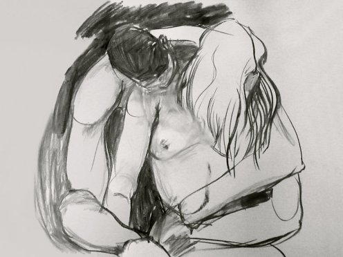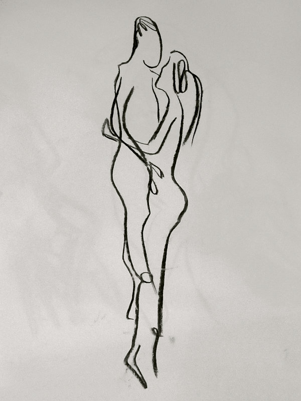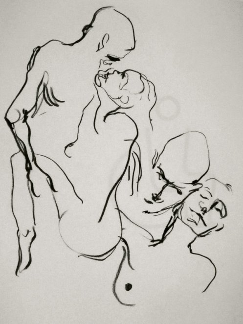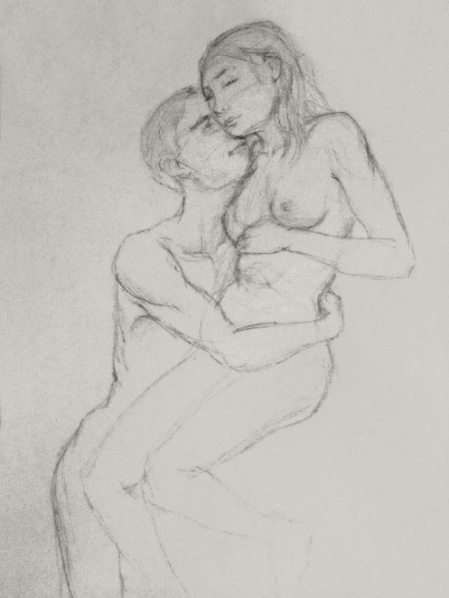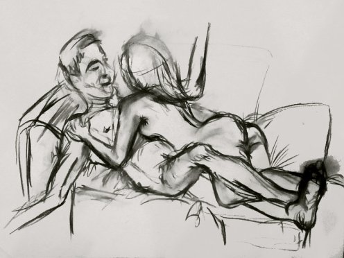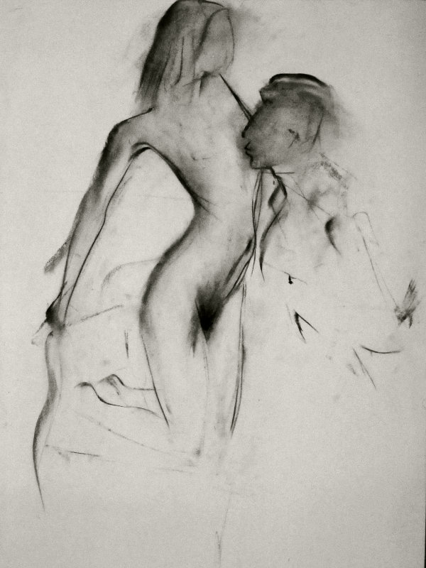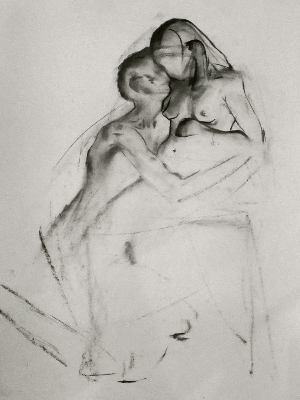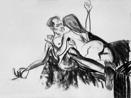 Luisa of London Drawing Group told us this was a life drawing theme she had been wanting to present for a long time. It was a feeling that both Esther and I shared; we’d modelled as a duo for many sessions, yet ‘Art of Love’ would at last give us licence to pose truly as a couple. Luisa sent us images of ten great artworks that she would like us to interpret, so we practised before walking to Buster Mantis in Deptford.