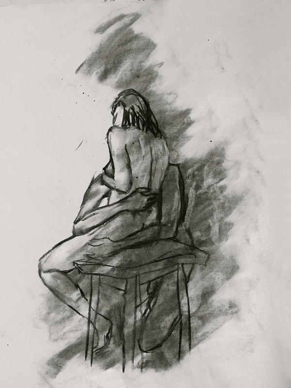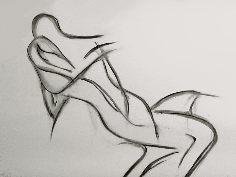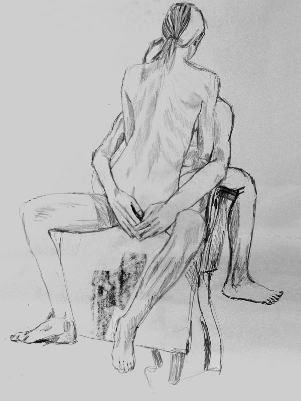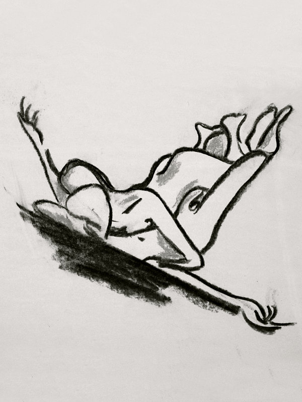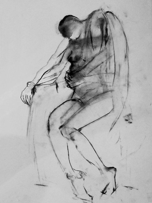 Our pose space was prepared: we had a sofa, stool, chair, and floor on which to work, whilst a sell-out group of a dozen artists occupied seats in a tight semi-circle. Behind us Luisa projected original artworks, but first – before we attempted any of those – we free-styled our own set of three 2-minute standing poses. Next, for 2-minutes we were in homage to the back-bending ‘Eternal Springtime’ by Auguste Rodin.
