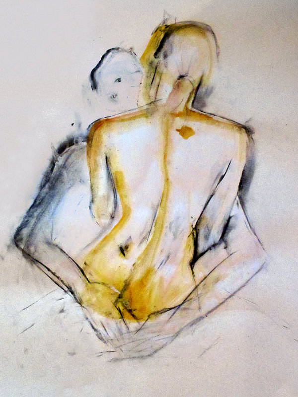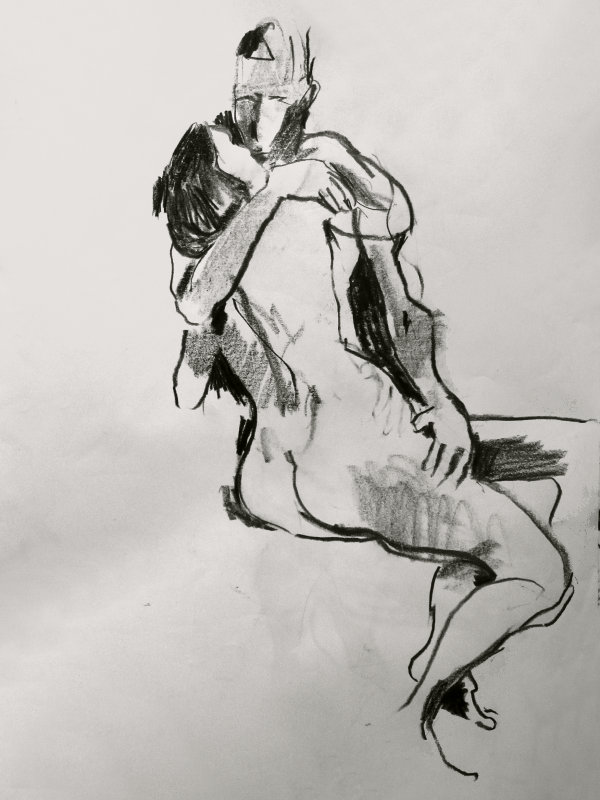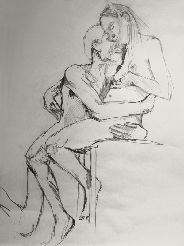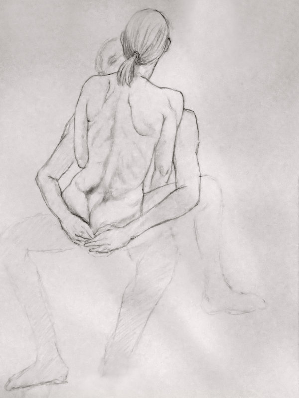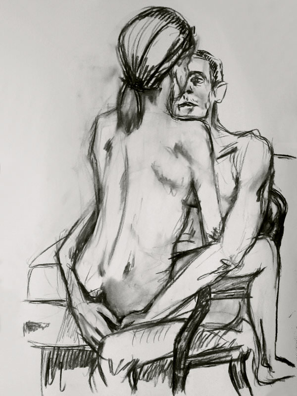 With half an hour remaining of our 3-hour session, Luisa gave us the freedom to pose in any way we wanted, up to the 7pm finish. We selected a pose we’d tried just once before, at The Cambria, for which I sat on a chair and Esther sat on my legs, facing me. It’s a lovely pose and I was pleased to give the advantage to artists at either side of us, as for most of the session I felt we’d unavoidably favoured artists at the front.