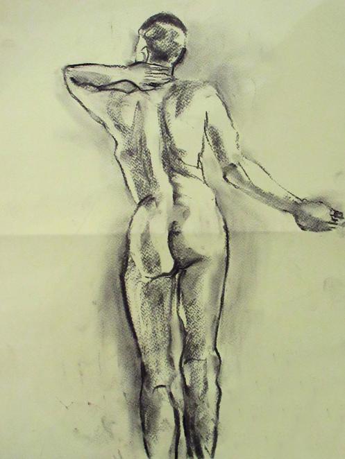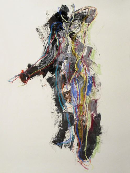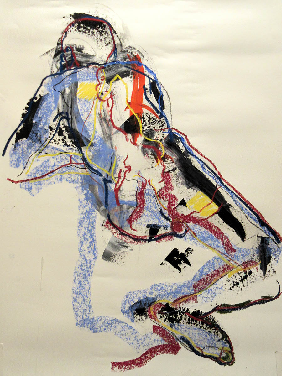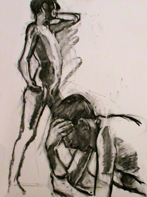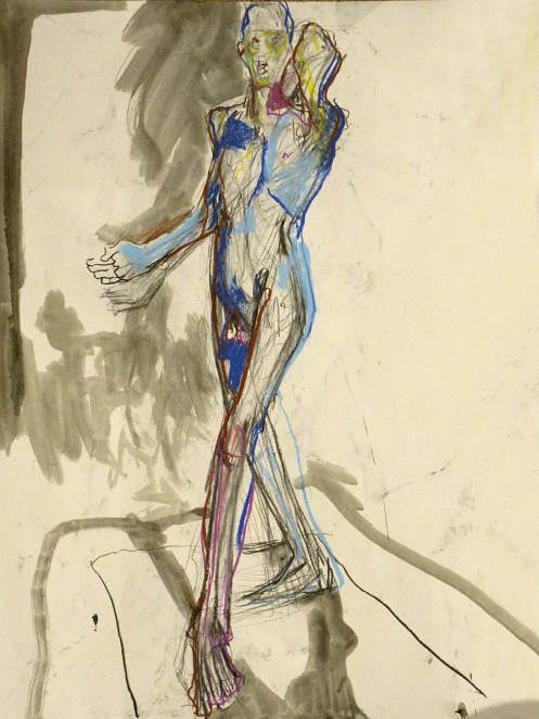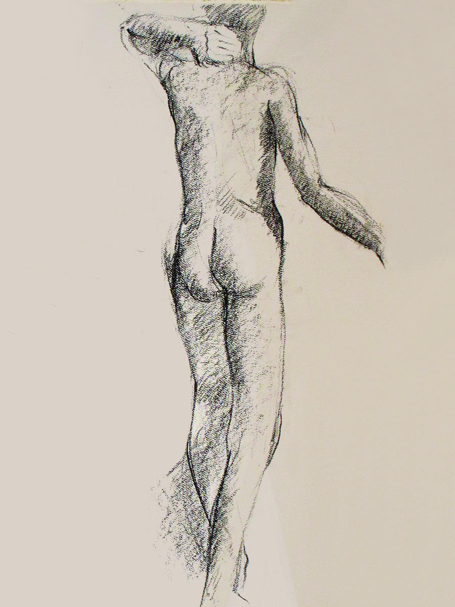 Oh, the suffering! My four 30-minute poses for Hesketh Hubbard Art Society at Mall Galleries began with me standing. My left hand clutched the back of my neck and its elbow was raised, while my right hand reached out slightly to the side, and my stance was open. My left elbow became sore but was tolerable. I made the mistake, however, of supporting my full upper body weight on it throughout the next half-hour. By the end of that half-hour I was trembling with pain; right pose, wrong sequence.