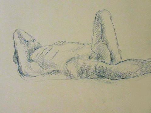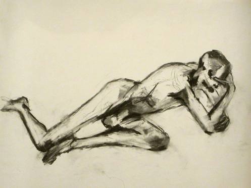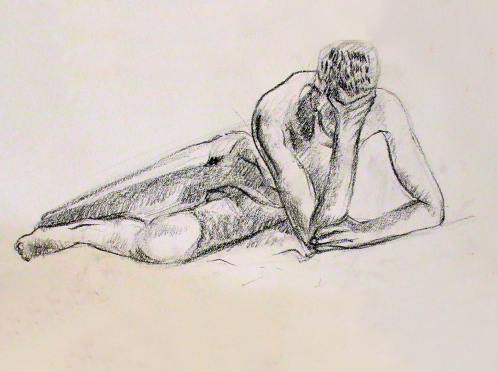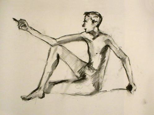 After the break, my third pose was a repeat of one I first tried on Monday at Anerley and Penge life drawing: sitting with one knee up and a pointing arm rested upon it, whilst the other arm reaches backwards as a balance. It looks potentially tricky but in practice was comfortable enough to tempt me into trying something unduly difficult for my finale… nearly. Professional experience eventually reminded me it would be better to lay down, albeit with a few twists.