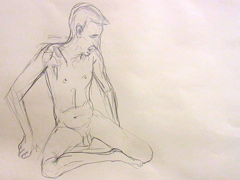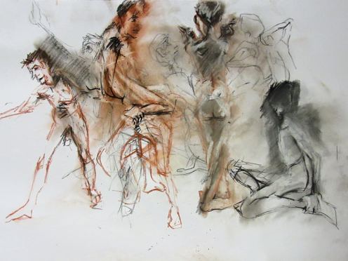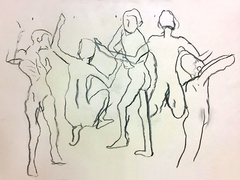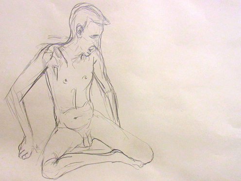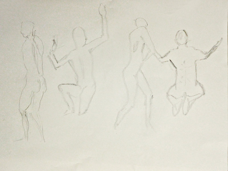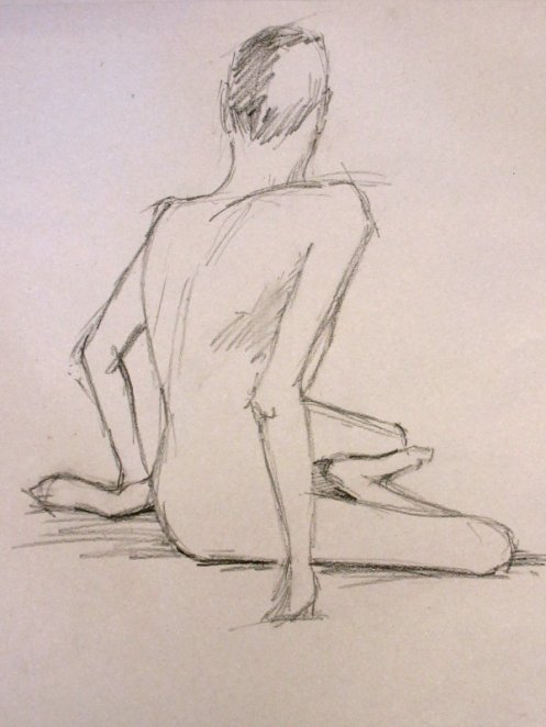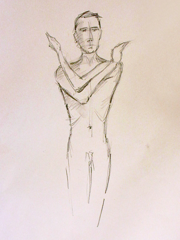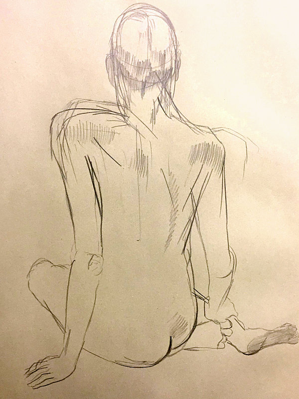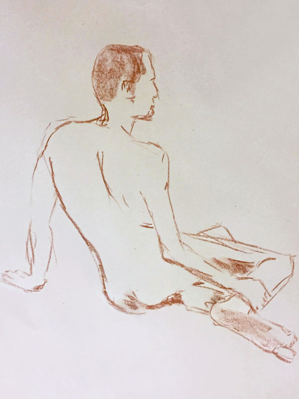 We would begin with five poses of 2-minutes, which the 12 artists were encouraged to draw with their off hand – if right-handed, use the left, and vice-versa. Thus, I thought it best to make my poses less challenging than I normally do for short work. Two poses of 5-minutes came next, then three of 10-minutes taking us to a break. It was a warm evening, but there was no danger of me overheating as I was squarely in the firing line of a fearsome electric fan that could have powered a light aircraft.