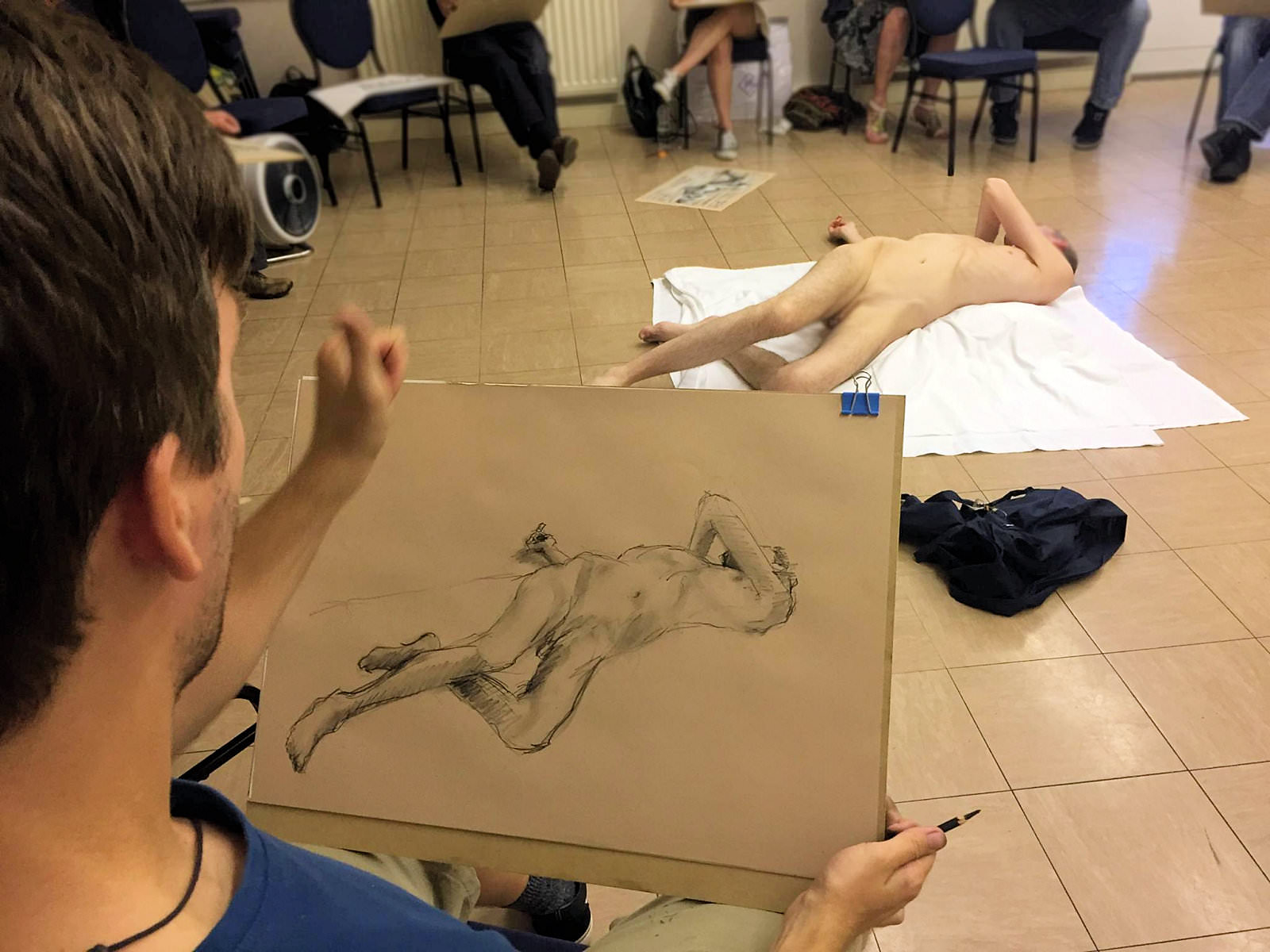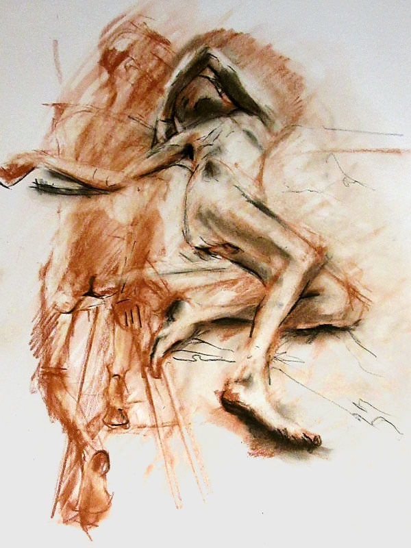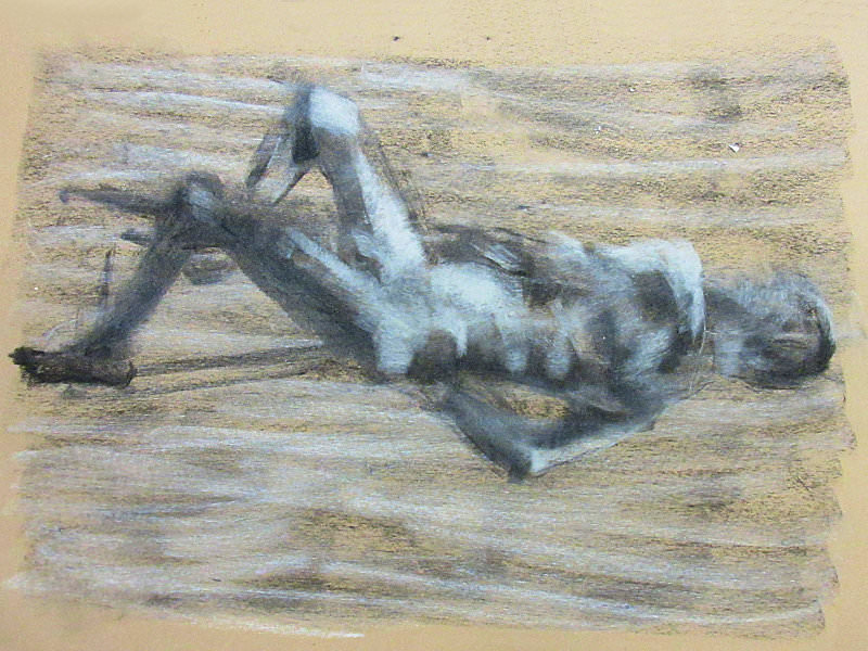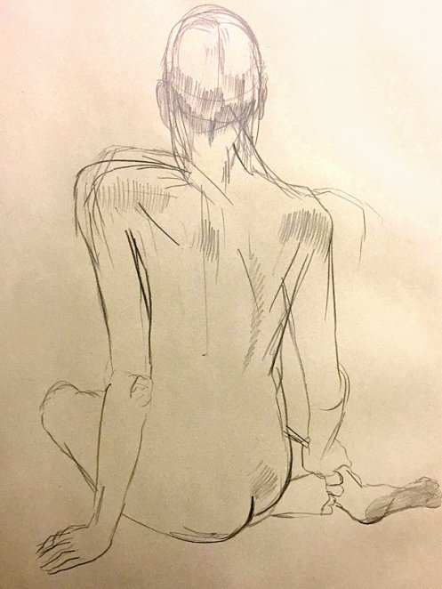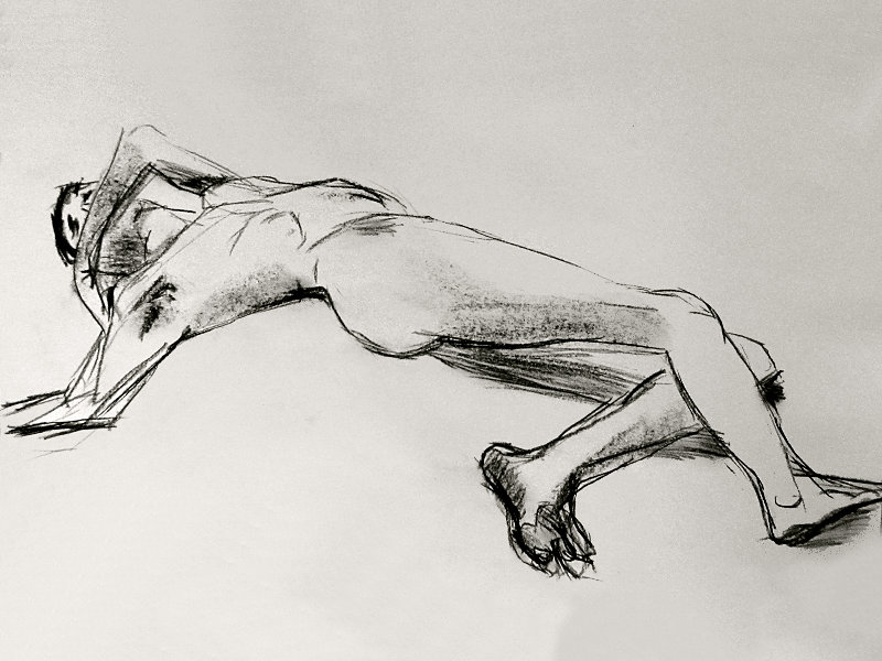 Surely this is a lucky group for me as wine and nibbles have been supplied twice, and I was their model on both occasions – this one celebrated the day before’s birthday of group organiser, Jake. After a generous gulp of merlot, I completed the session sitting on a stool for 15-minutes, and then laying down for a shade under half an hour. Twists were added to both poses, maximising the angles with interesting views. Jake offered tips to those who sought advice, and in all it was another truly pleasant evening.