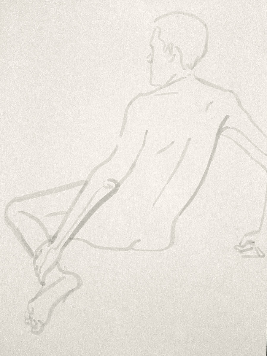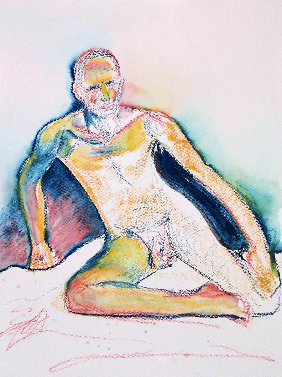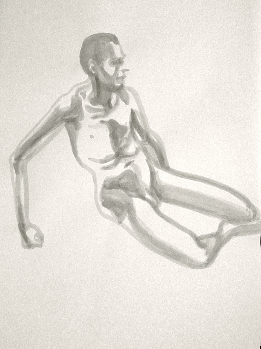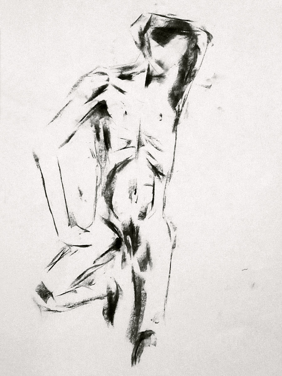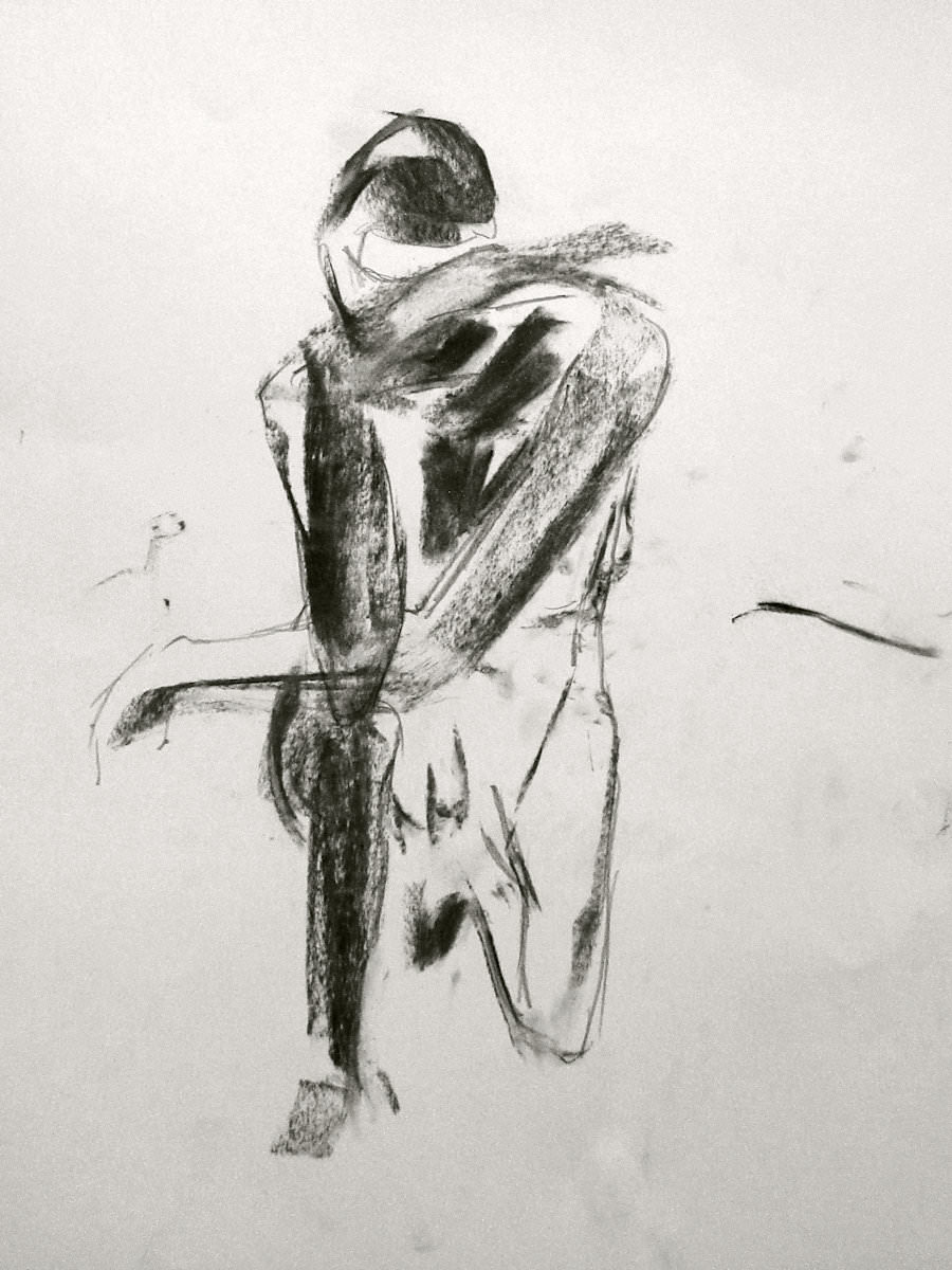 Democracy reigns after the break at Drawing the Star. Its organiser, Catherine Hall offers her artists a vote on whether to go for one 30-minute pose, two of 15-minutes, a 10 and 20, or three 10-minute poses. The first to speak preferred a full half-hour, whilst others had no strong opinion, so a long pose it would be. I eyed the pile of pillows and sheets on the floor… “Don’t lay down completely,” grinned Catherine, so I settled down into an angular yet comfortable seated posture.