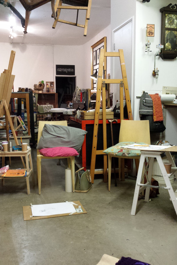 Pimlico being one of London’s more salubrious areas, I’d set out with a preconceived notion that the venue would be some pristine, minimalist white-space gallery. Instead what I found was an art and retail home for the most wondrous characterful collection of magnificently random objects crammed high and wide, from floor to ceiling. I would be posing in a small clearing by the door for a full-house group of 10 artists, including Karen. We started with five 1-minute poses, two of 5-minutes and two of 10-minutes.