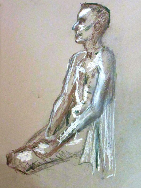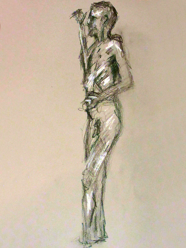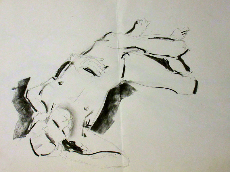 The artists were all local women; charming, encouraging and enthusiastic. Karen was a down-to-earth, warm, engaging host, whose passion for life drawing could barely be contained. After an interval for tea and biscuits, we ended with two 25-minute poses. I think we overran a little, but time matters less when the feeling is good. Our evening’s soundtrack came courtesy of Barry White and Tears for Fears CDs; musical nostalgia was never more fitting than in this environment. A lovely session.