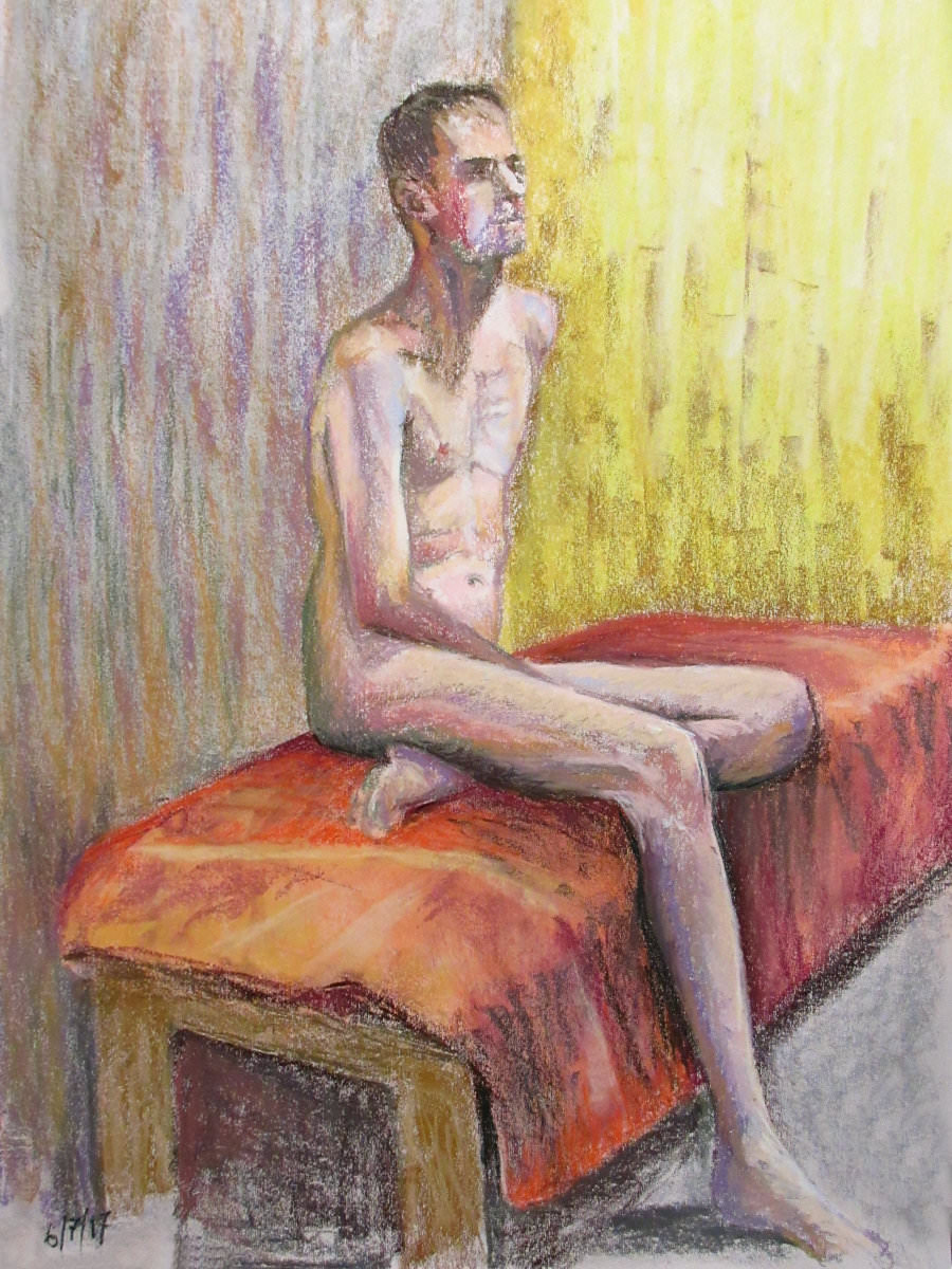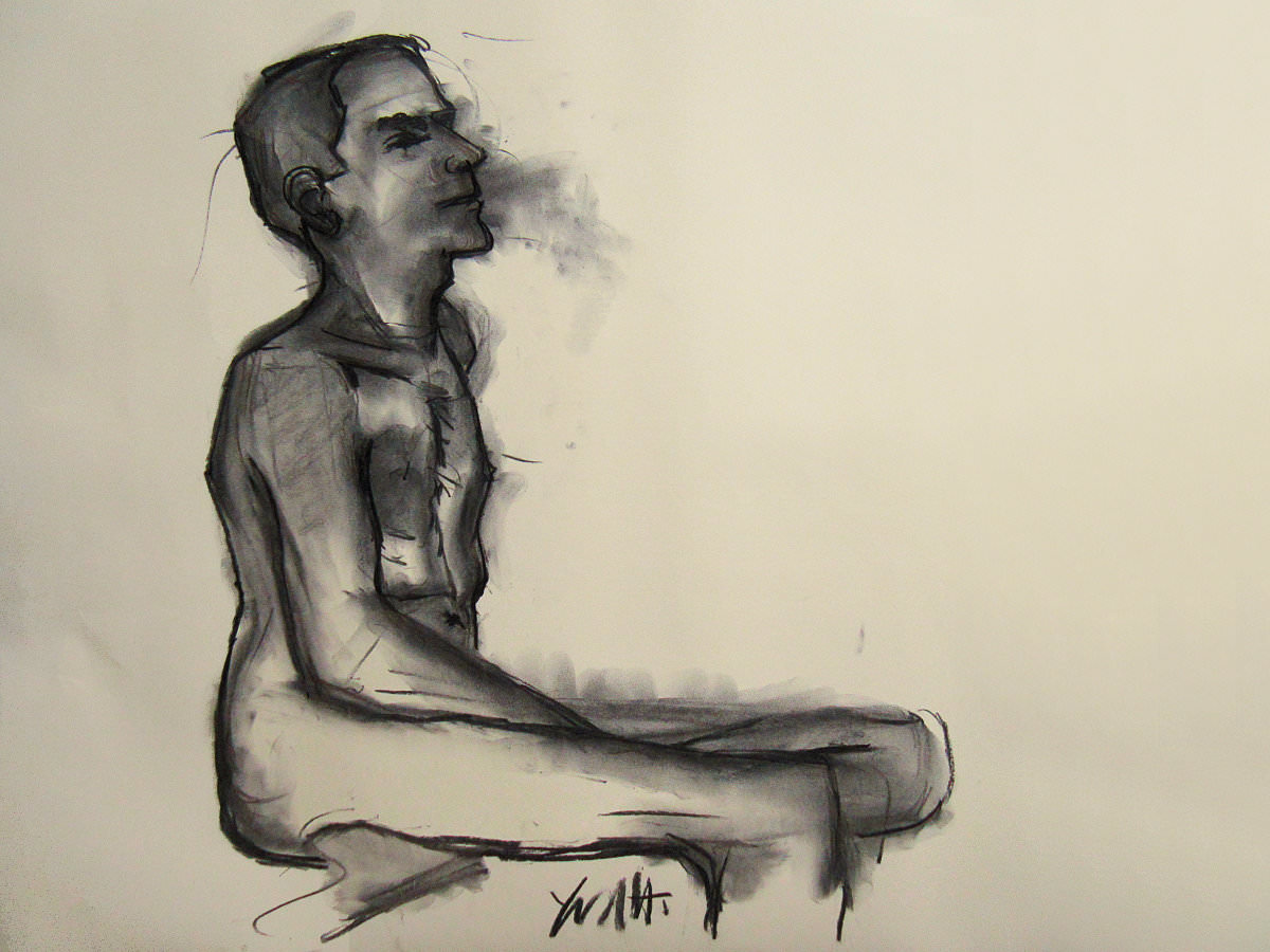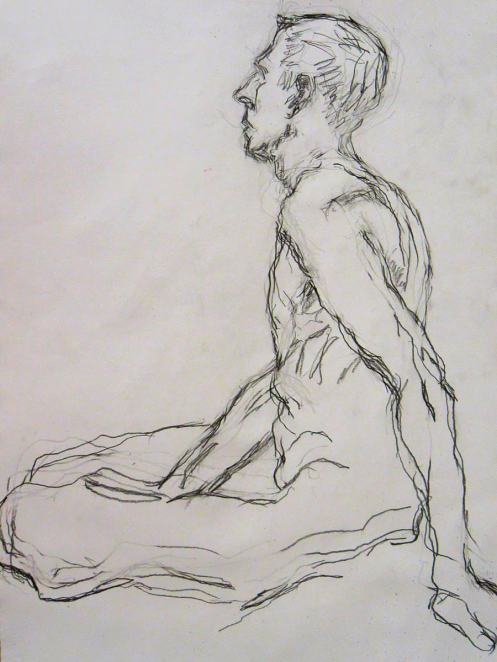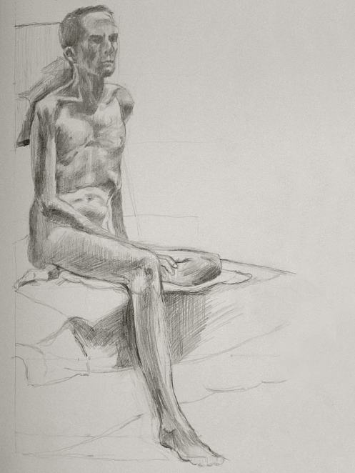 The 2-hour pose would be divided into two halves of one-hour each without breaks for stretching. Once settled in position I would stay motionless for an hour at a time; not too harsh in itself, yet just because a pose is simple doesn’t necessarily mean there will be no discomfort. In this instance, upon reorganising my limbs I’d allowed my left hand to reach slightly behind and rest on the bench that supported me. The arm was not bearing any weight but the wrist was bent backwards and increasingly became a nagging ache.