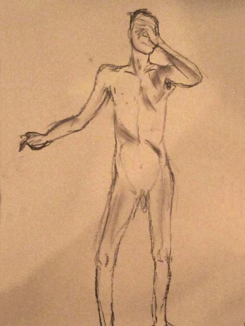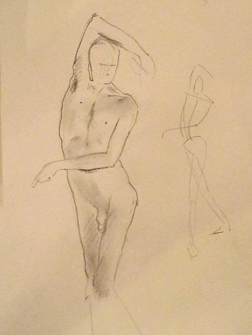 I gave consideration to my poses beforehand so the fire of life would not become a fire of pain. Each pose would be sustainable for the given time: three of 2-minutes, four of 5-minutes, and three of 10-minutes up to a break, then three of 15-minutes to end the session. There was to be no laying around – I stood, sat, squatted, knelt on one knee and knelt on both knees. Plenty of extended arm work, too. The latter went down well with one artist who thanked me afterwards for the challenge it gave him.