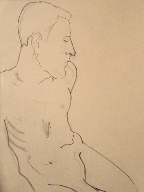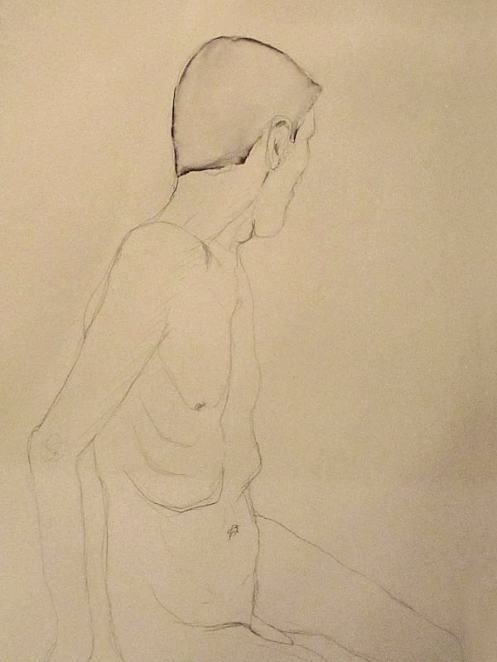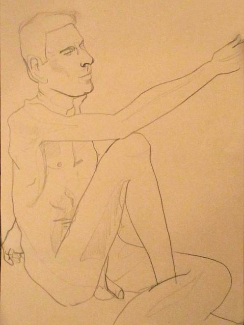 The final three poses were all seated: the first, an elongated side-saddle posture on a chunky foot-rest; the next was on the floor with one knee raised and an arm extended across it; the third was on a chair, once again with a knee up, but now in the crook of an elbow, and the fingers of both hands interlocked. It all felt good; I enjoyed my work. Artists were engaged too, as individuals moved seats a couple of times to get a more desirable view – which itself is a bit of a compliment. Just the tonic I needed.