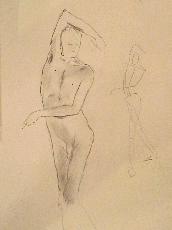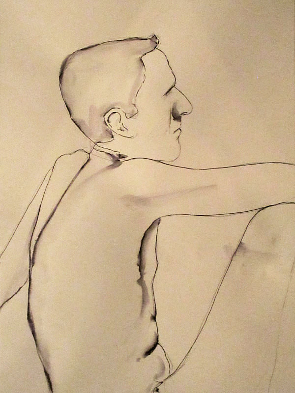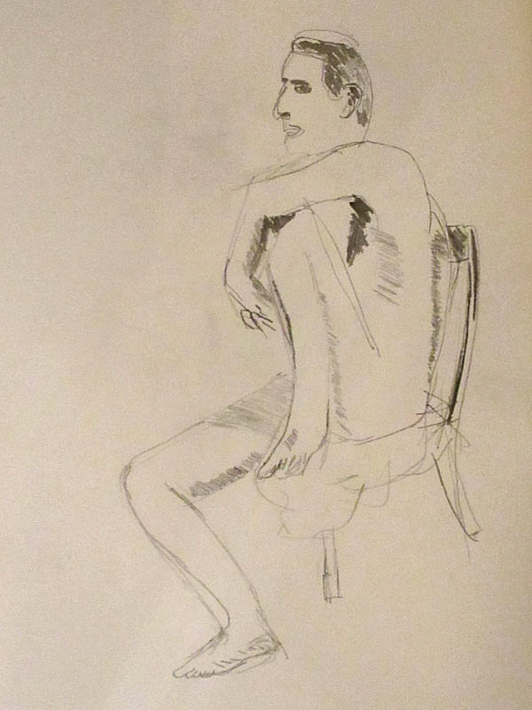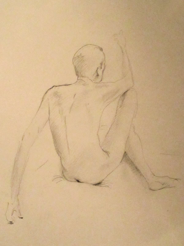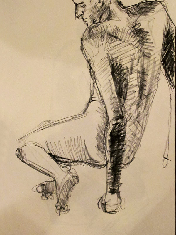 The final three poses were all seated: the first, an elongated side-saddle posture on a chunky foot-rest; the next was on the floor with one knee raised and an arm extended across it; the third was on a chair, once again with a knee up, but now in the crook of an elbow, and the fingers of both hands interlocked. It all felt good; I enjoyed my work. Artists were engaged too, as individuals moved seats a couple of times to get a more desirable view – which itself is a bit of a compliment. Just the tonic I needed.