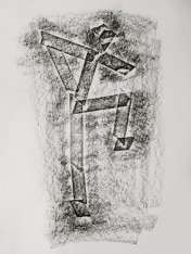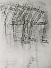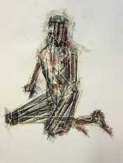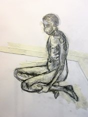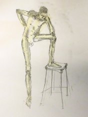 For 20-minutes I was to stand in front of a large A-frame ladder, my elbows crooked and left knee bent. Artists were to sketch all the in-between spaces but try to avoid directly capturing the lines of my figure. This proved a tough task. Far more fun was the challenge of capturing my basic form using flat masking tape on paper, drawing over it, and then creating a graphite rubbing of the relief. For this, I stood leaning for 20-minutes with one foot upon a high chair.