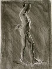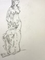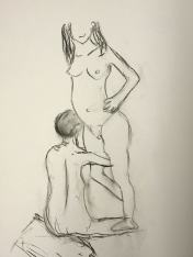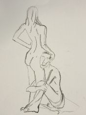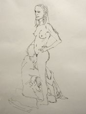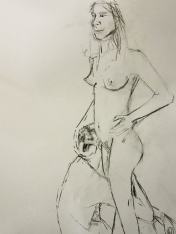 The studio was ideal: a fully equipped art room with easels and large cushions for the models. We hastily cleared the centre space, set-up the easels and provided drawing materials for each artist. It then fell for me to provide the icebreaker pose – 5-minutes standing. I withdrew to one corner, removed my clothes, and wrapped a sheet around my waist. When called, I stepped forward, dropped the sheet and got into position.