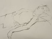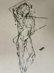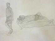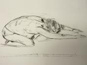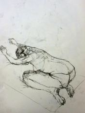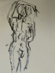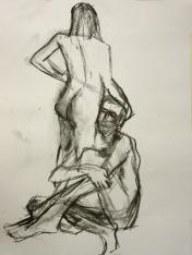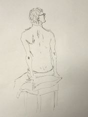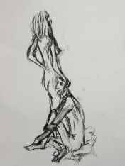 Spirited Bodies is model-centred. Esther shares advice and experience then asks the group: who would like to try modelling for themselves? Three said they would give it a go. First a woman who initially was unsure about men being in the room (me and one other), but then decided to pose with a sheet around her waist, reclining and standing for 5-minutes each. Next was my fellow male, with two poses of 10-minutes each.