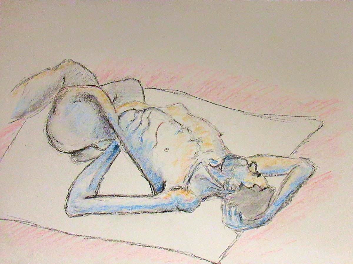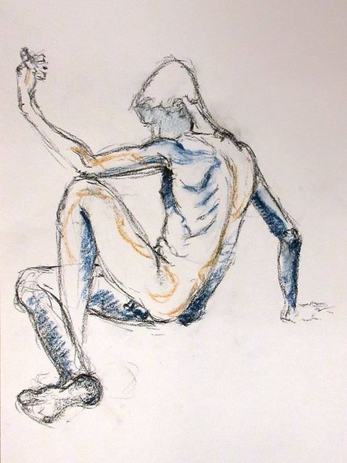 I’d enjoyed my poses yesterday so tonight I honed them further, making a better job of aligning them to the various durations. We proceeded with three 2-minutes poses, two 5-minute poses, and two 15-minutes poses, taking us to an interval. After a half-hour’s break to enjoy assorted breads and dips, I concluded with two 30-minute poses. Good session; one or two aches afterwards – as is probably inevitable – but I am happy with how things are going. And it was great to be back for London Life Drawing.