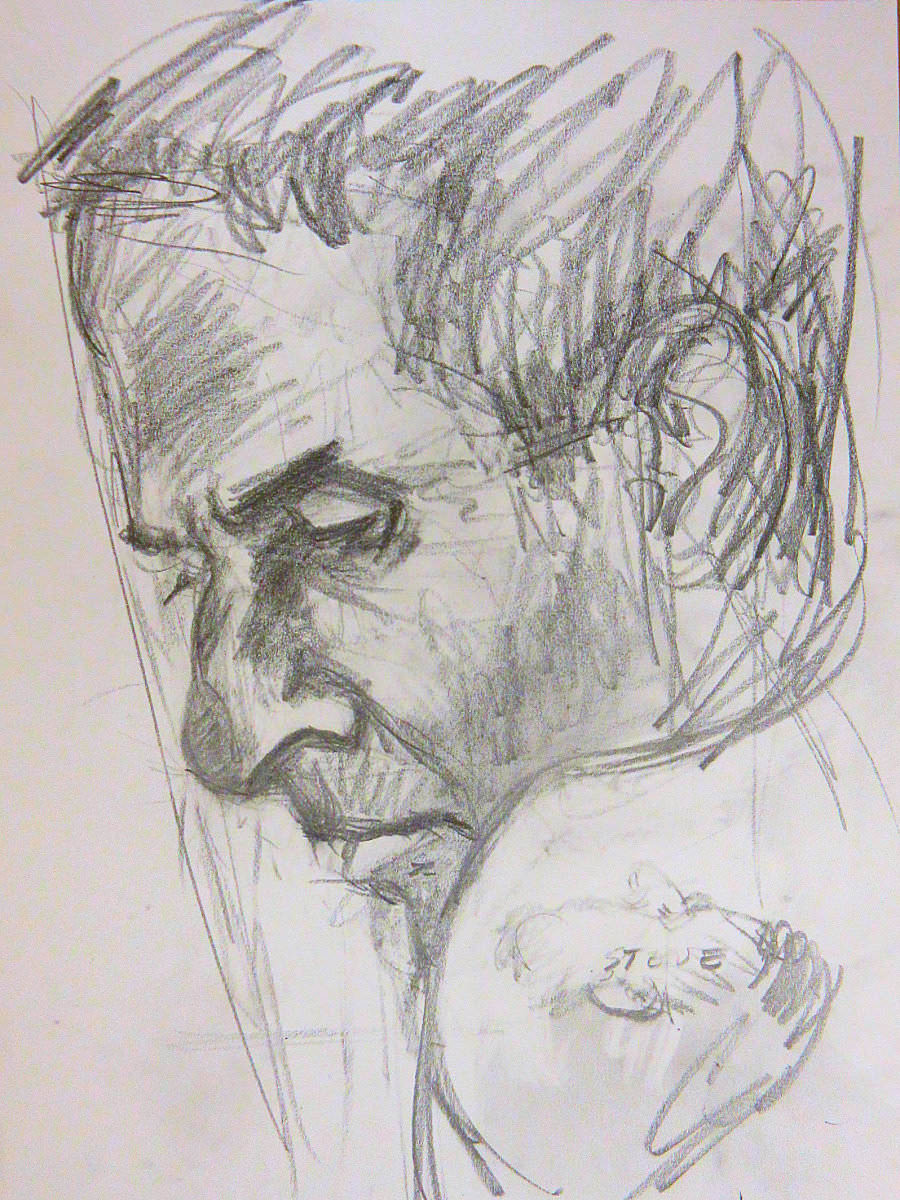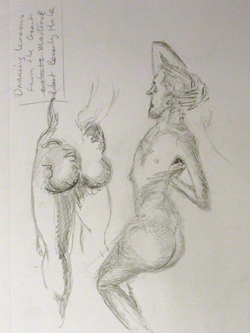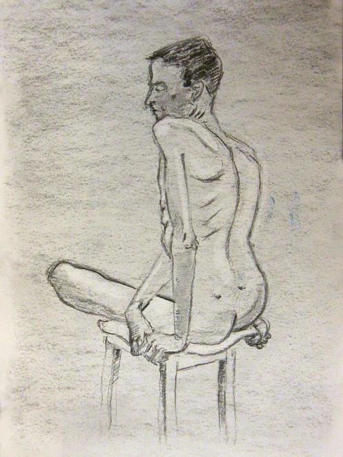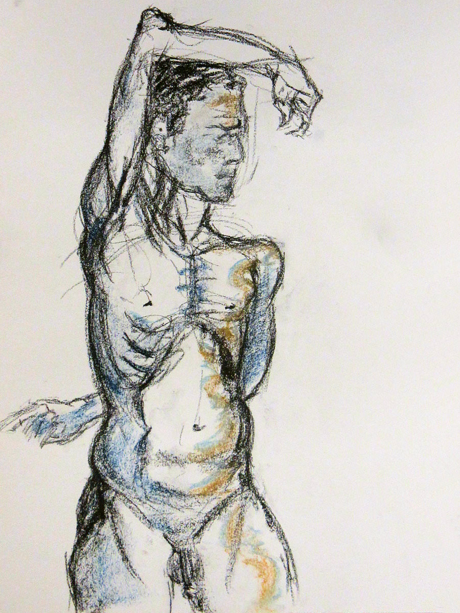 Having been fairly astonished to find myself posing for a bumper crowd of 31 artists at The Sun on Monday, I was doubly impressed that no fewer than 32 turned up to draw me the next evening. My June visit to The Workshop had barely two-thirds as many. Truly, life drawing picks up in a big way after the summer months. As is traditional, we started with a 10-minute standing pose – a stride, twist and sideways gesture – which allowed latecomers time to settle down before we moved onto quicker work.