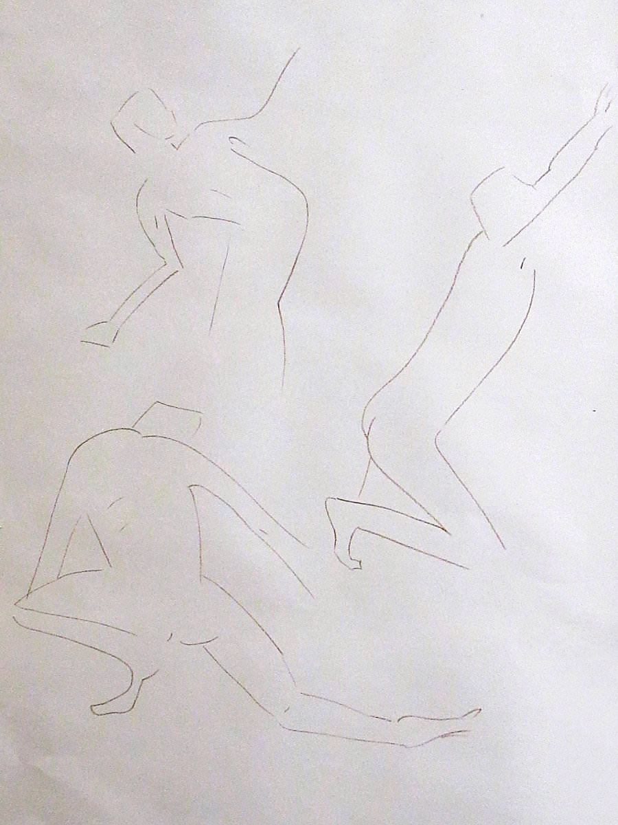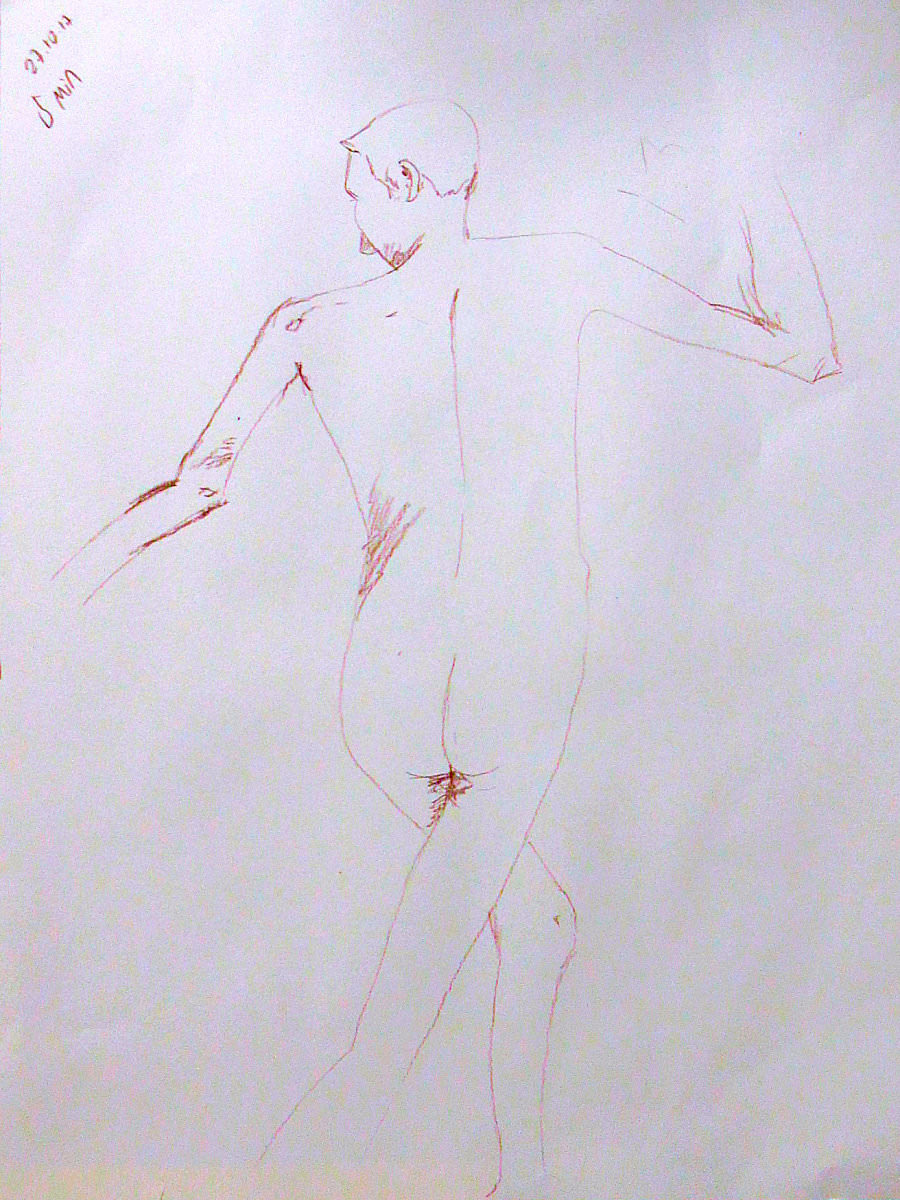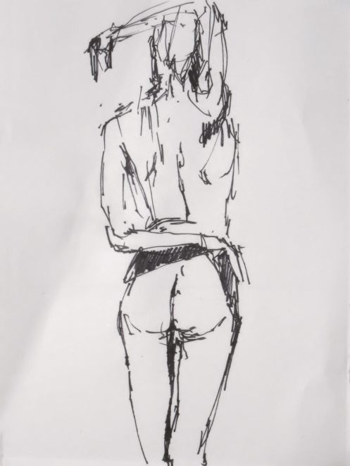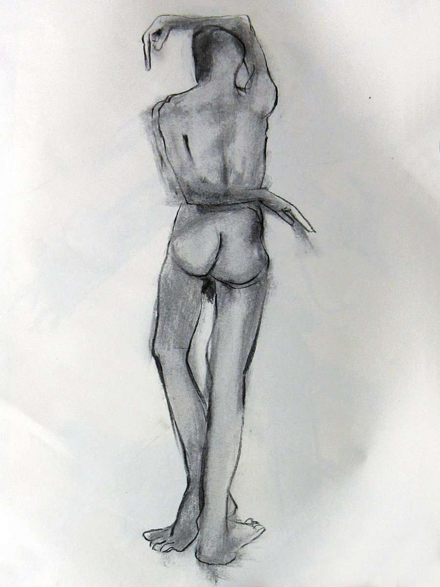 A second stretch-break also lasted a generous 15-minutes as one of the artists kindly shared a bottle of wine to celebrate Victoria’s recent show – a very nice gesture. After this we had time for a final 20-minutes in pose. It had taken around ten minutes to get started, and we ended five minutes early so everybody would have a chance to look at the completed drawings – I reckon I was posing for nearly an hour and a quarter of the maximum possible two hours. Thus, there is more to life drawing than merely drawing; allow for preparation, scrutiny, rest, adjustment, interaction… the life in life drawing.