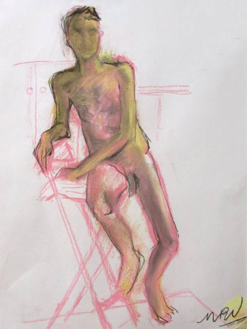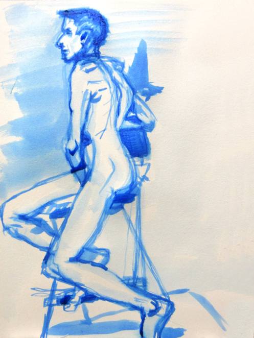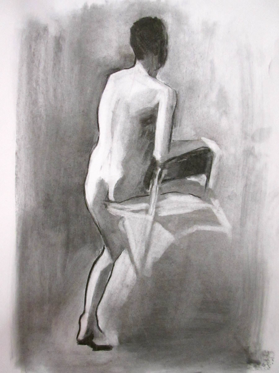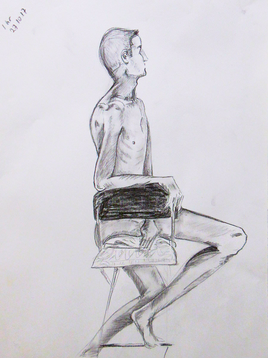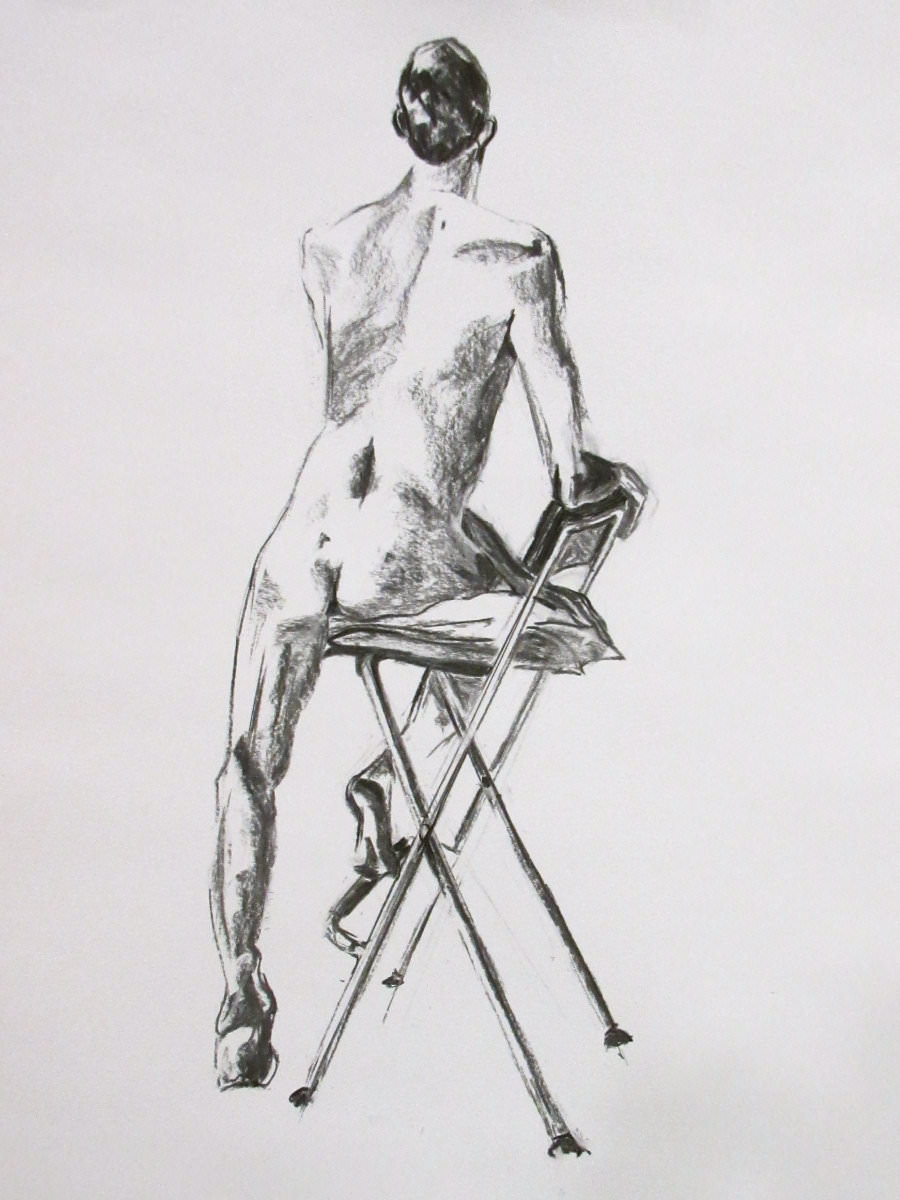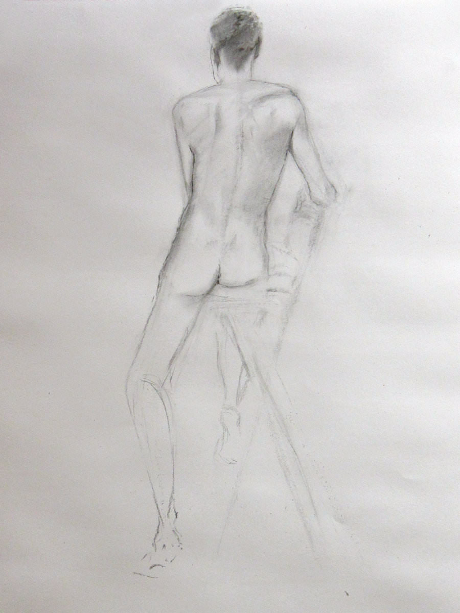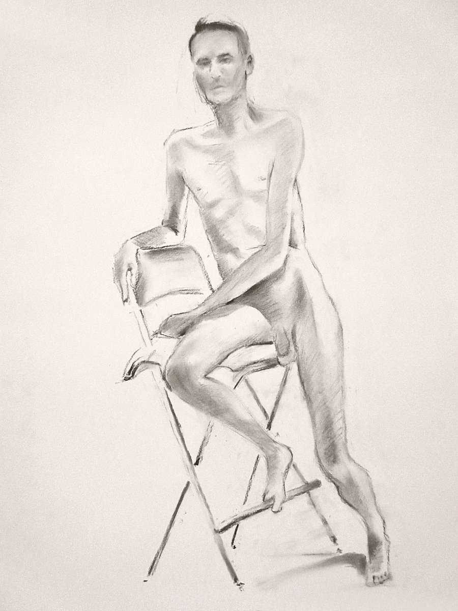 Having warmed-up our twelve artists, we moved on to the session’s long pose – set to occupy the 2-hours from 8pm to 10pm. Let us review the dynamics… First comes the selection of a suitable pose in the round. We considered perching on a piano seat but this felt too folded and uninspiring, so next we tried a high chair. As I randomly leaned against it with one arm resting on its back, Victoria suggested this could be my poise for the rest of the evening. Very well. I removed my robe and made myself comfortable while artists made their first marks. I remained thus for 30-minutes before a time-out.