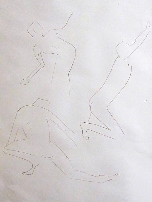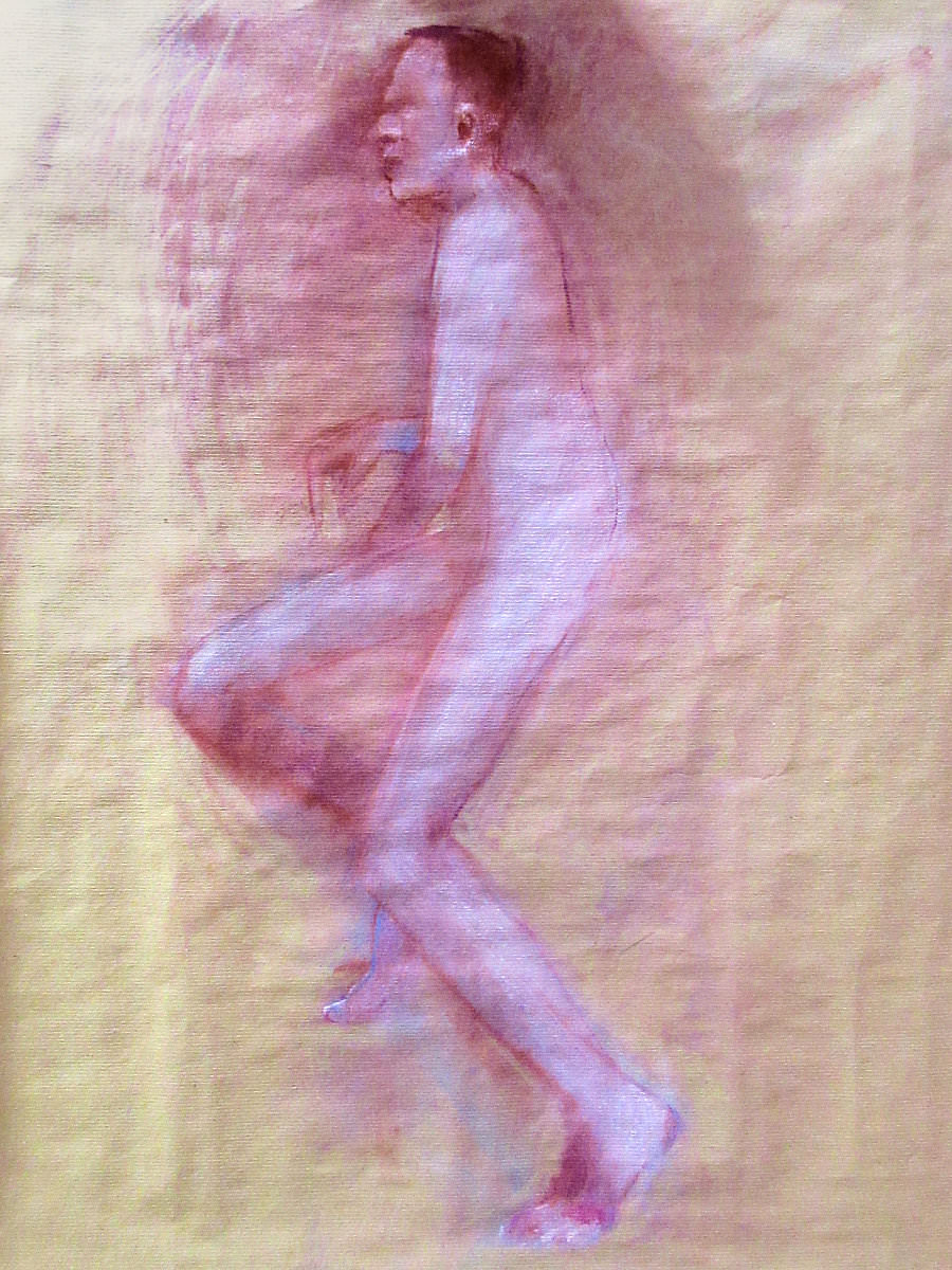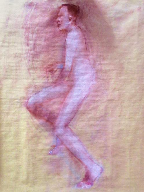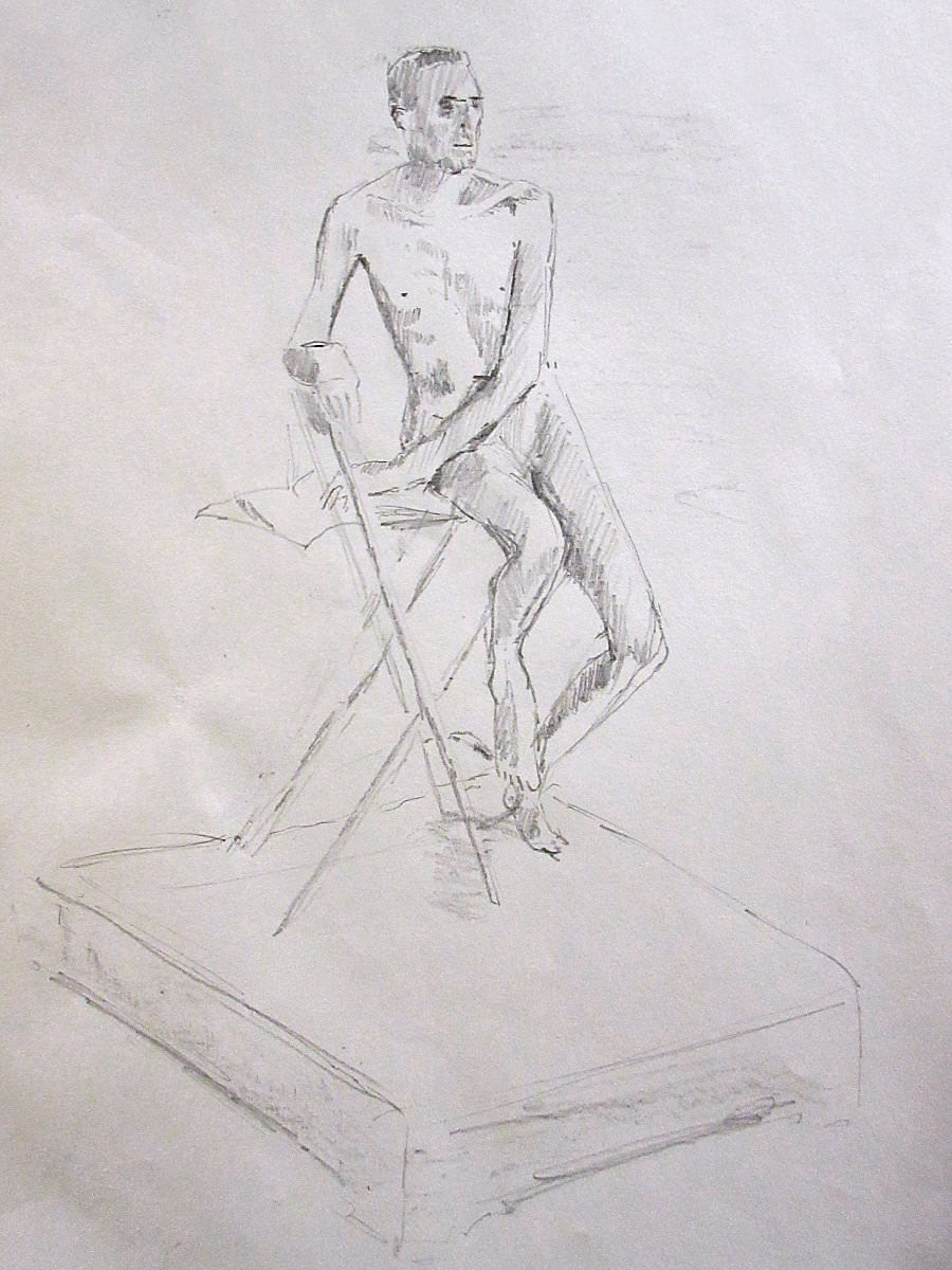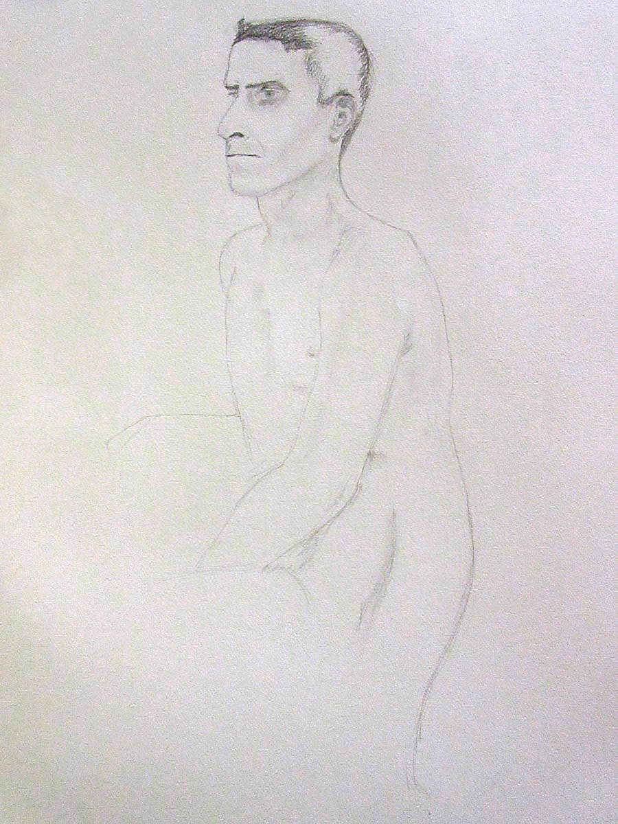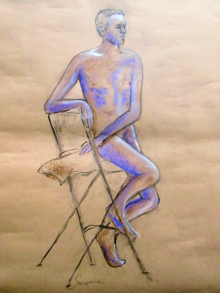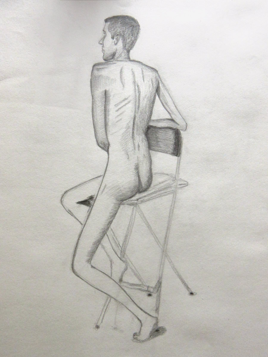 Having warmed-up our twelve artists, we moved on to the session’s long pose – set to occupy the 2-hours from 8pm to 10pm. Let us review the dynamics… First comes the selection of a suitable pose in the round. We considered perching on a piano seat but this felt too folded and uninspiring, so next we tried a high chair. As I randomly leaned against it with one arm resting on its back, Victoria suggested this could be my poise for the rest of the evening. Very well. I removed my robe and made myself comfortable while artists made their first marks. I remained thus for 30-minutes before a time-out.