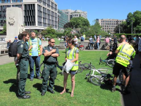 I arrived at Trinity Square Gardens a tad before 2pm and found Esther already there, fresh from life modelling in Aldgate. People with bikes were loitering about, bathing in warm sunshine on park benches or lounging on well manicured grass. We applied our sun cream and waited for friends. Cy and Natansky appeared first, then Adrian, Chas, Paula, and many more familiar faces – all veterans of the London Naked Bike Ride.