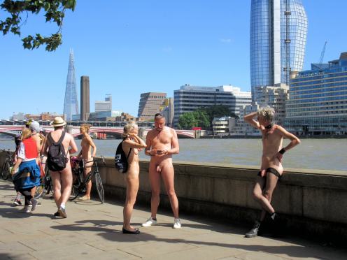 Upon restarting, boisterous spirits were soon rediscovered as we ventured into wholly uncharted territory for a London Naked Bike Ride: down Southwark Bridge Road for a right into Sumner Street, then round the southern side of Tate Modern and right again into Southwark Street. One last right at the traffic lights took us into Blackfriars Road. This novel deviation had been very much Cy’s baby. Round of applause for Cy!