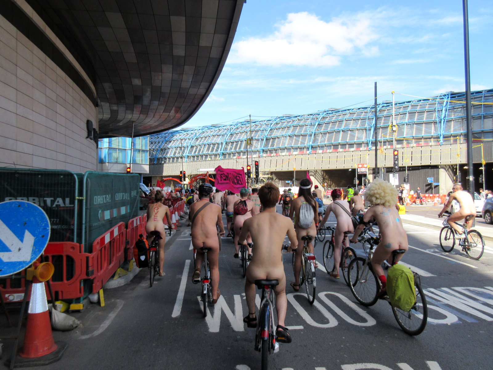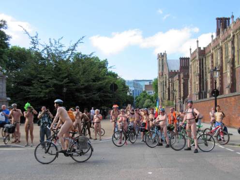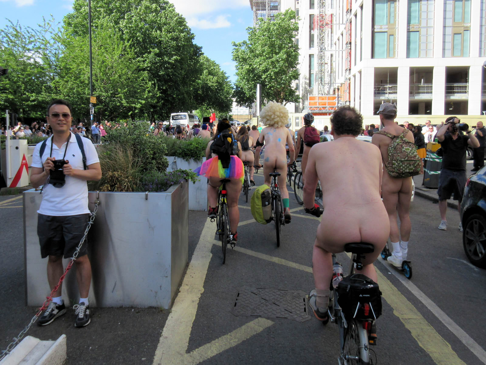 At ten-to-three Nat decided it was time for us to line-up in readiness to depart. Cy led us out, followed by Esther, then me. Chas brought up the rear with a walkie-talkie link to Cy, whilst Nat roved between, trying to impose a semblance of organisation on 200 naked or semi-naked cyclists. Regular marshal, Simon rocked up with sound system in tow, while another veteran – non-nude, fluorescent-clad – was ready to halt traffic.