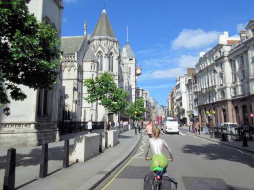 We had almost caught up with the groups ahead of us. On Chancery Lane, we cycled between The Law Society to the left and King’s College to the right, before swinging a left into Carey Street. Here we passed venerable legal chambers such as The Knights Templar and The Seven Stars before of a right turn into Serle Street. Directly ahead of us lay Lincoln’s Inn Fields and an encouraging crowd of naked folk.