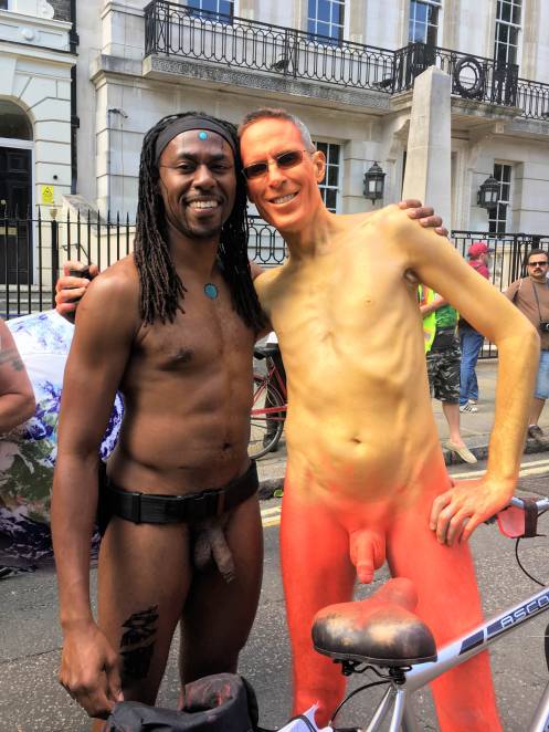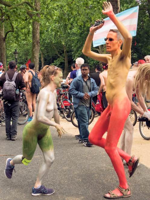 No apologies for saying it every year: the long cycle up the Mall remains a highlight of the London Naked Bike Ride. To be naked and carefree on this pristine flag-bedecked highway at the heart of monarchy and government, for me, encapsulates the essence of body freedom that we celebrate. After a bit of lingering outside Buckingham Palace, we rode up Constitution Hill and, finally, were shepherded to our finish at Green Park.