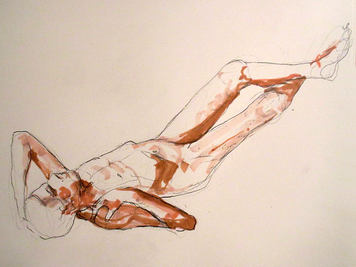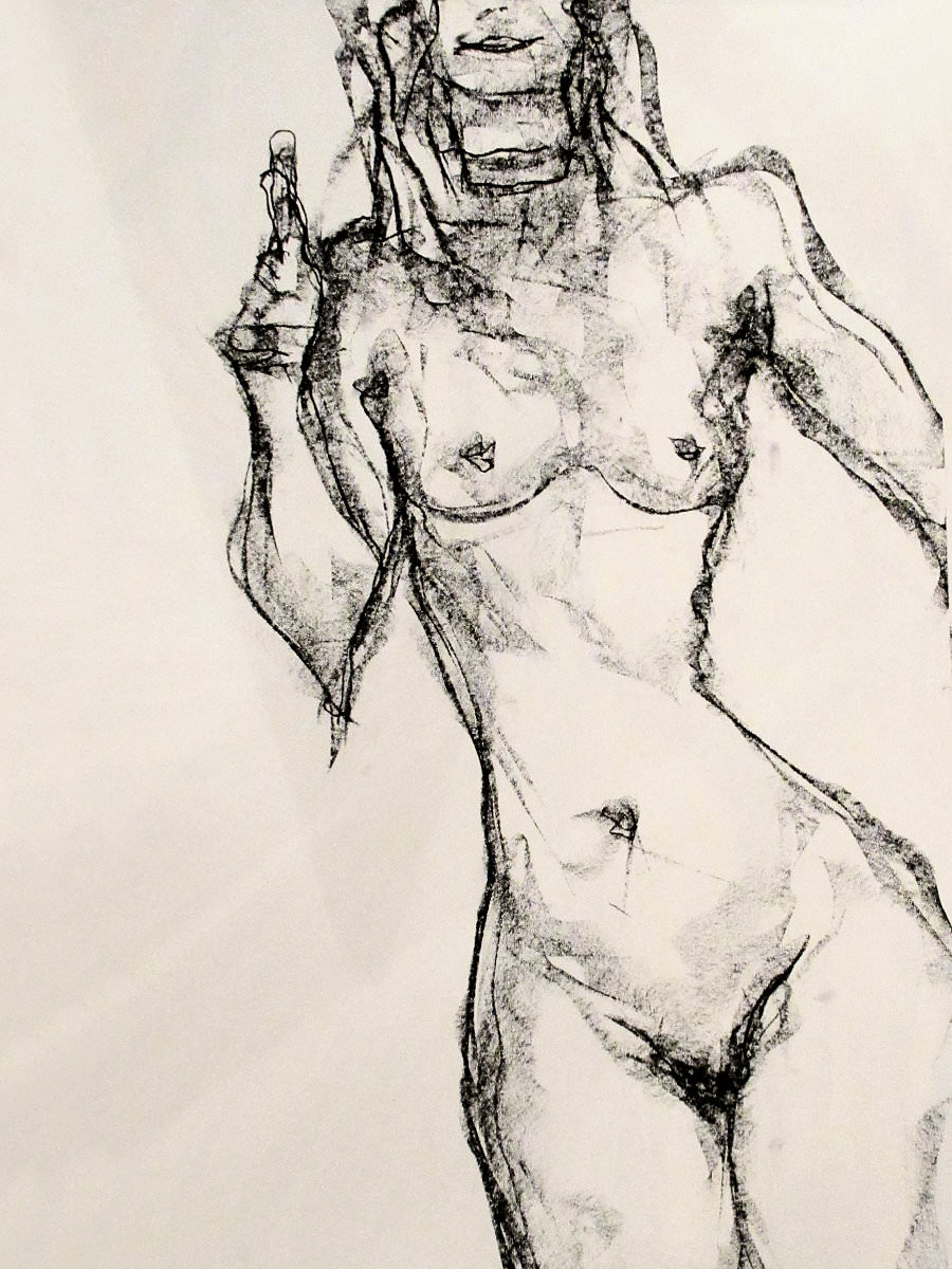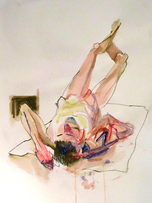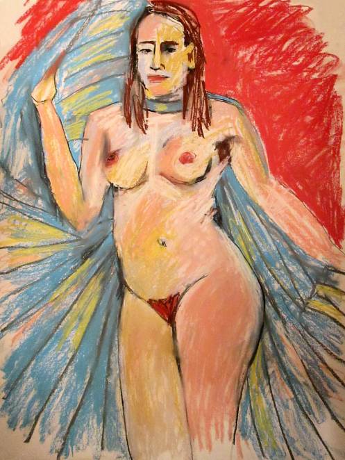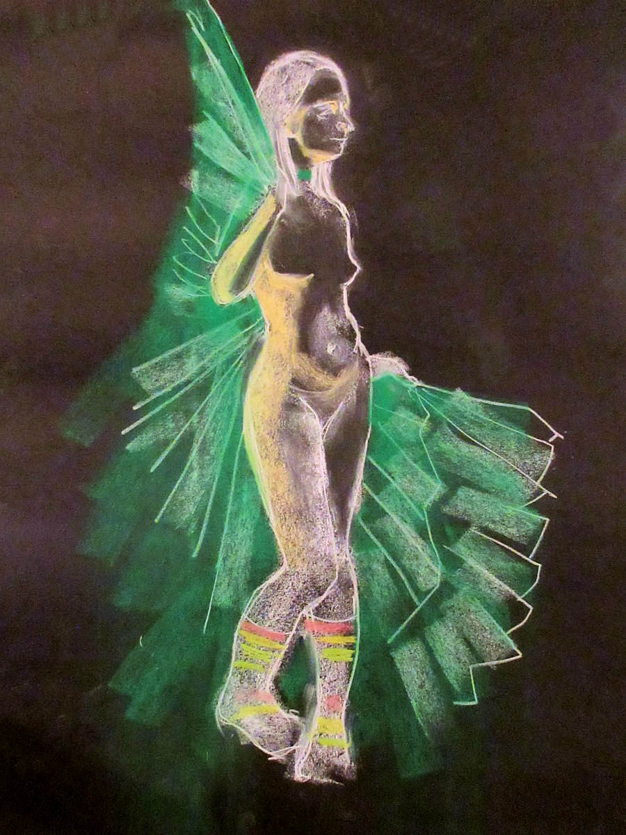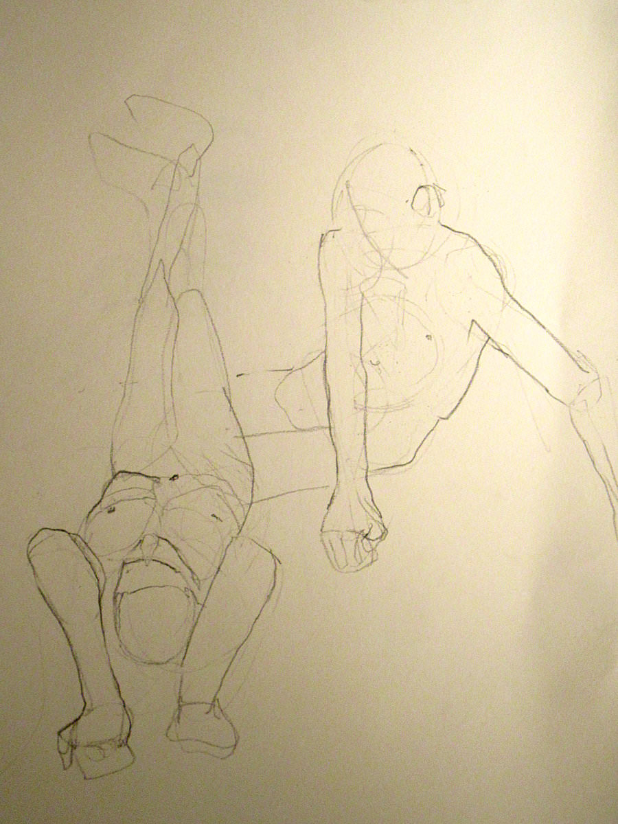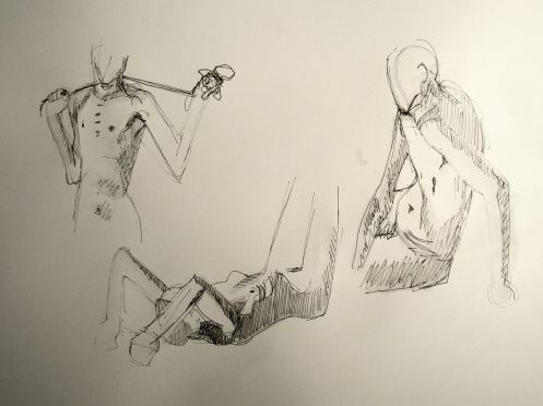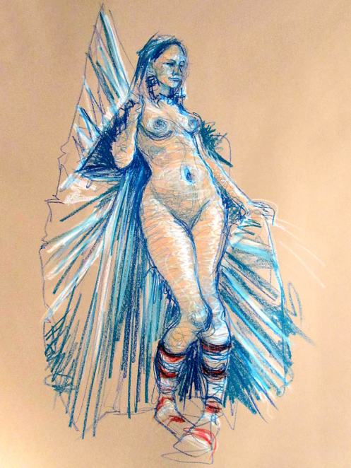 We had a greater turn-out of artists this evening so, alas, unlike last month we weren’t able to pose together for the whole session. Instead, we began in separate rooms; me bare with the rope and Esther in brilliant clothes that reduced to just wings and socks. We opened with a 10-minute standing pose then followed it with three 3-minute poses and three 5-minute poses. For 25-minutes up to the break, I was asked to reprise one of my shorter poses – laying down with feet resting on a level above me.