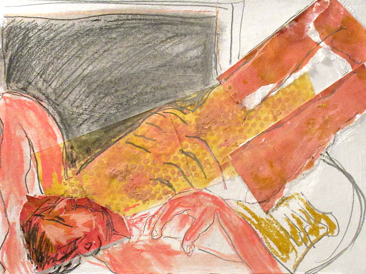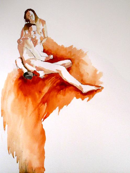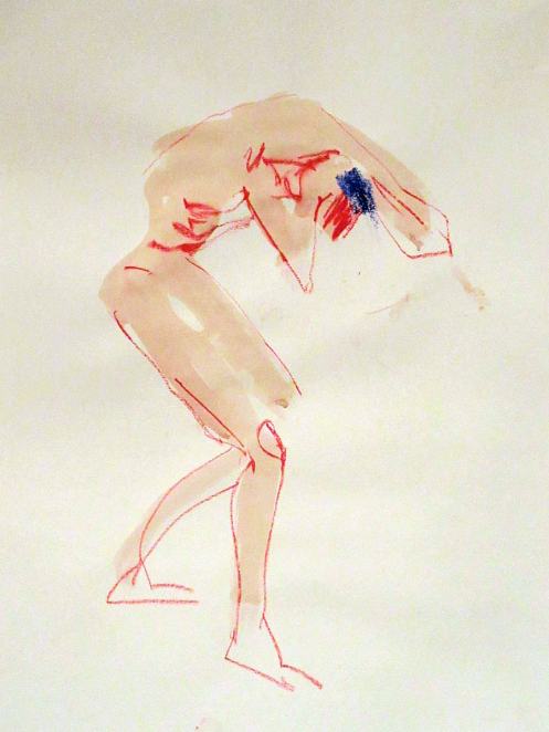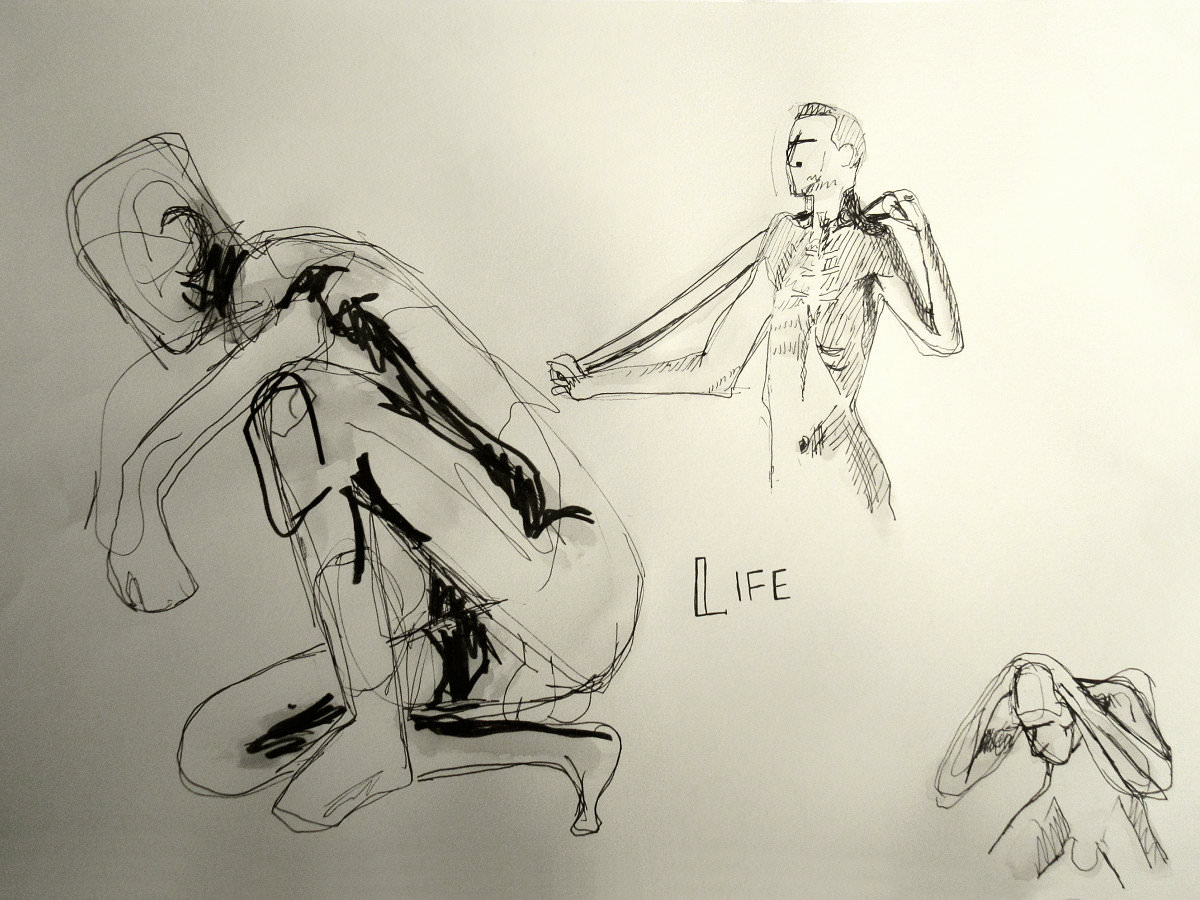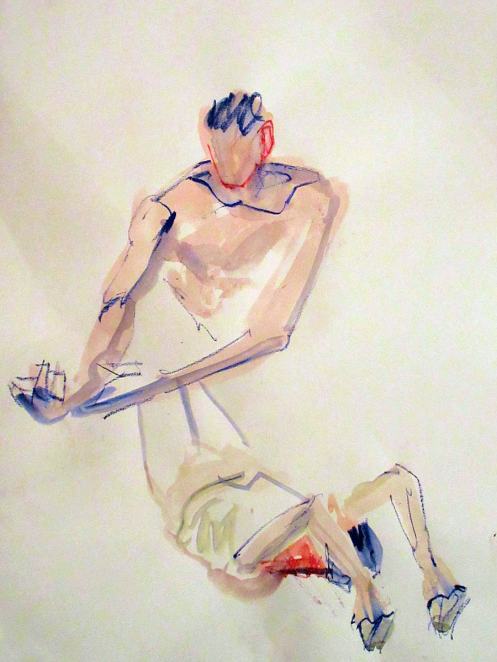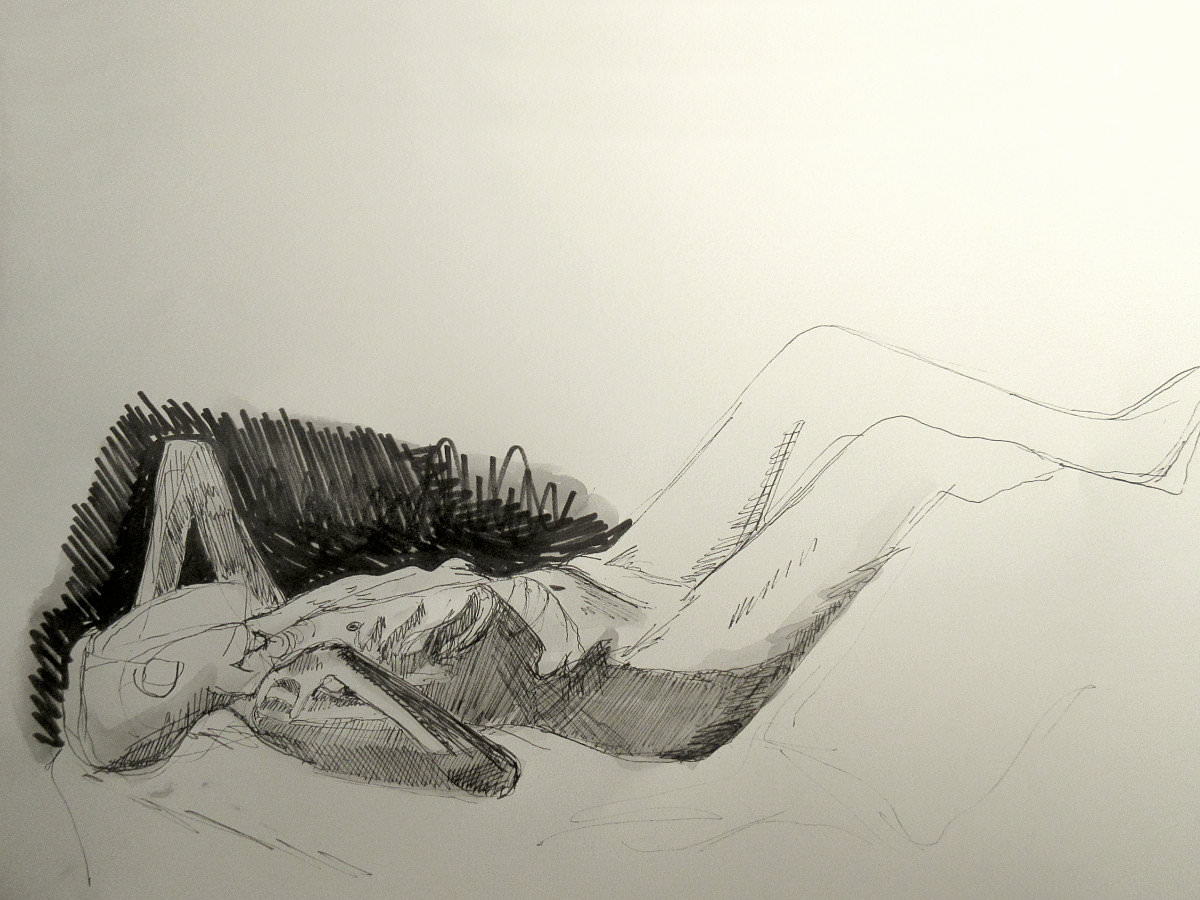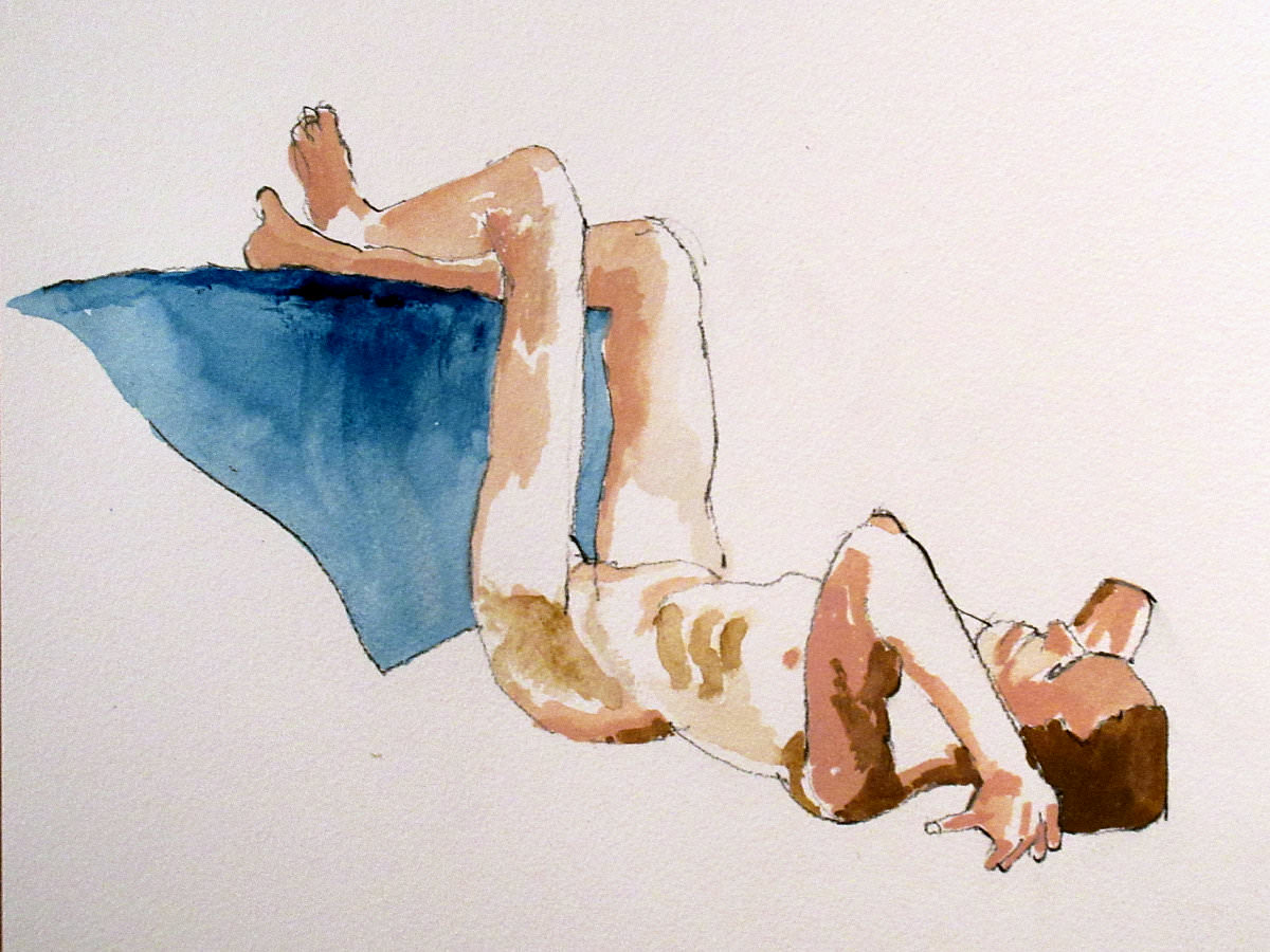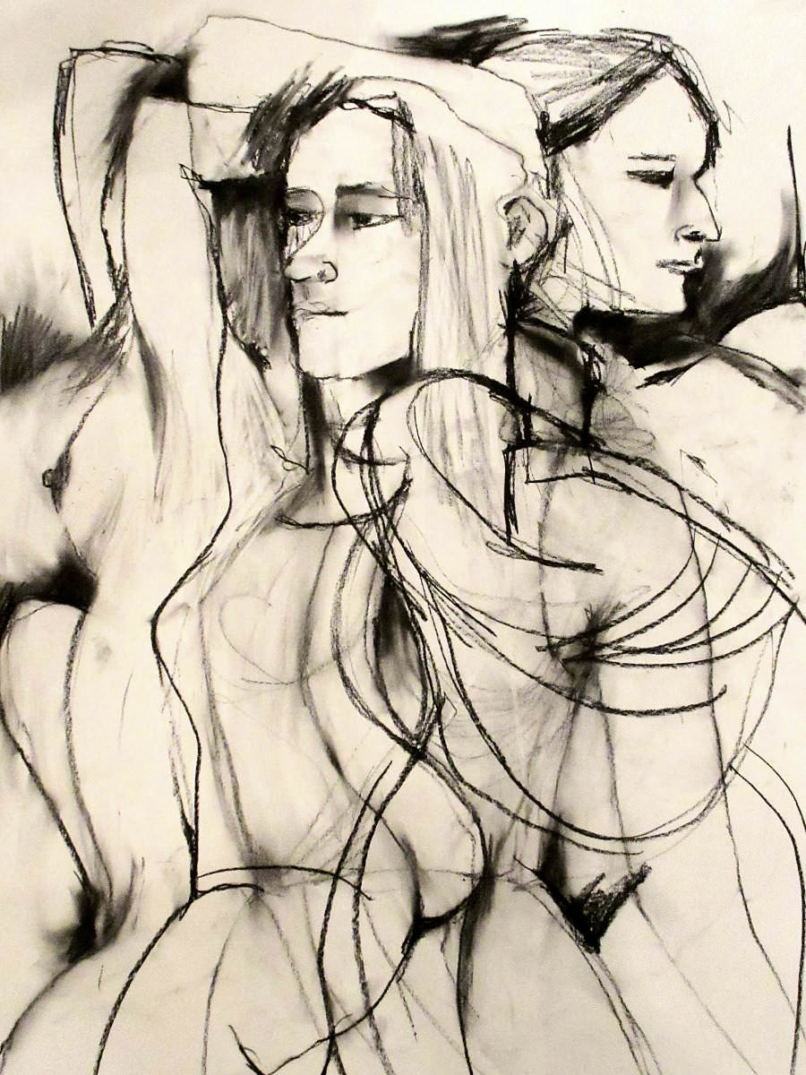 We had a greater turn-out of artists this evening so, alas, unlike last month we weren’t able to pose together for the whole session. Instead, we began in separate rooms; me bare with the rope and Esther in brilliant clothes that reduced to just wings and socks. We opened with a 10-minute standing pose then followed it with three 3-minute poses and three 5-minute poses. For 25-minutes up to the break, I was asked to reprise one of my shorter poses – laying down with feet resting on a level above me.