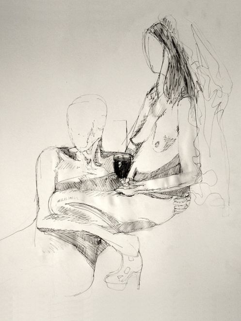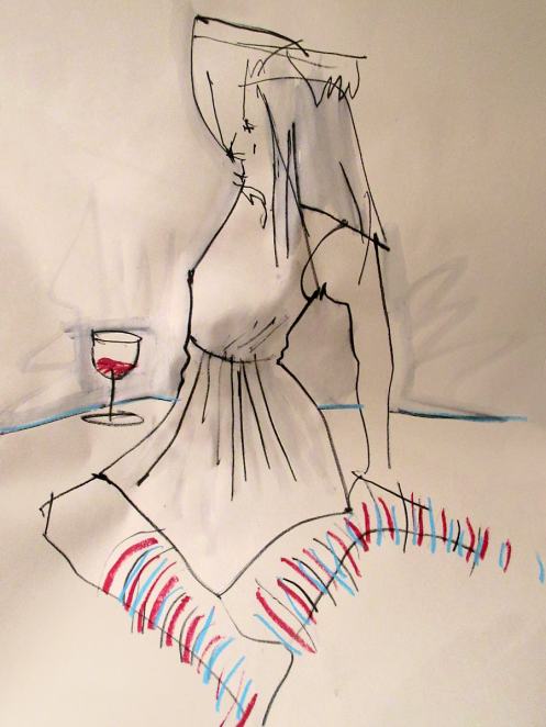 “Bring props!” was the farewell suggestion when Esther and I left The Prince Regent at the end of a fine duo session last month. We’d been blessed with two bookings for SketchPad Drawing this term, and organiser Lisa was thinking ahead to the second. I’m not flush with props myself, so my preparation was to arrive first and buy the wine. Esther, on the other hand, rocked up with rope, bridal veil, bow and arrow, shimmering wings, sparkling dress and some kick-ass heels.