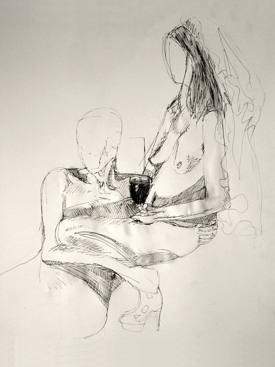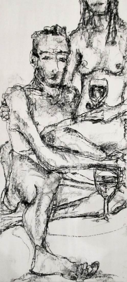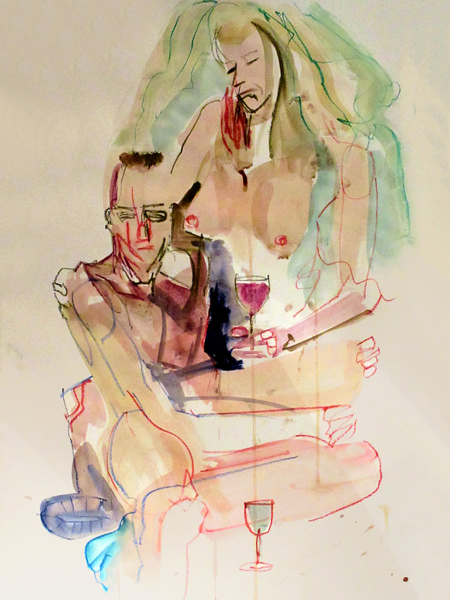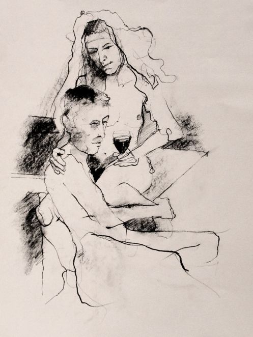 Whilst we were posing, Lisa had clearly been making assessments. She decided that for the second half it must be possible to bring all the artists together in a single room after all. Esther and I would embrace across a pair of tables in one long pose – Esther in bridal veil and heels, and both of us with half-full wine glasses to hand. After slightly too long luxuriating into position, we were set fair for the duration. Only one movement subsequently proved essential: Esther sneaking a swift sip of Rioja.