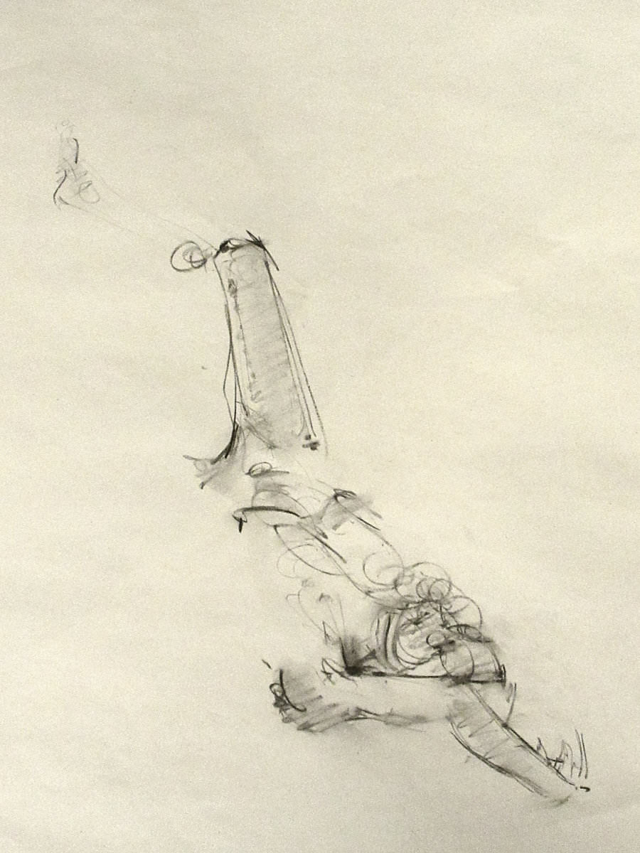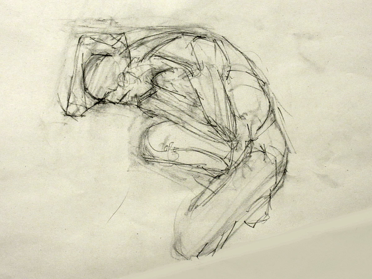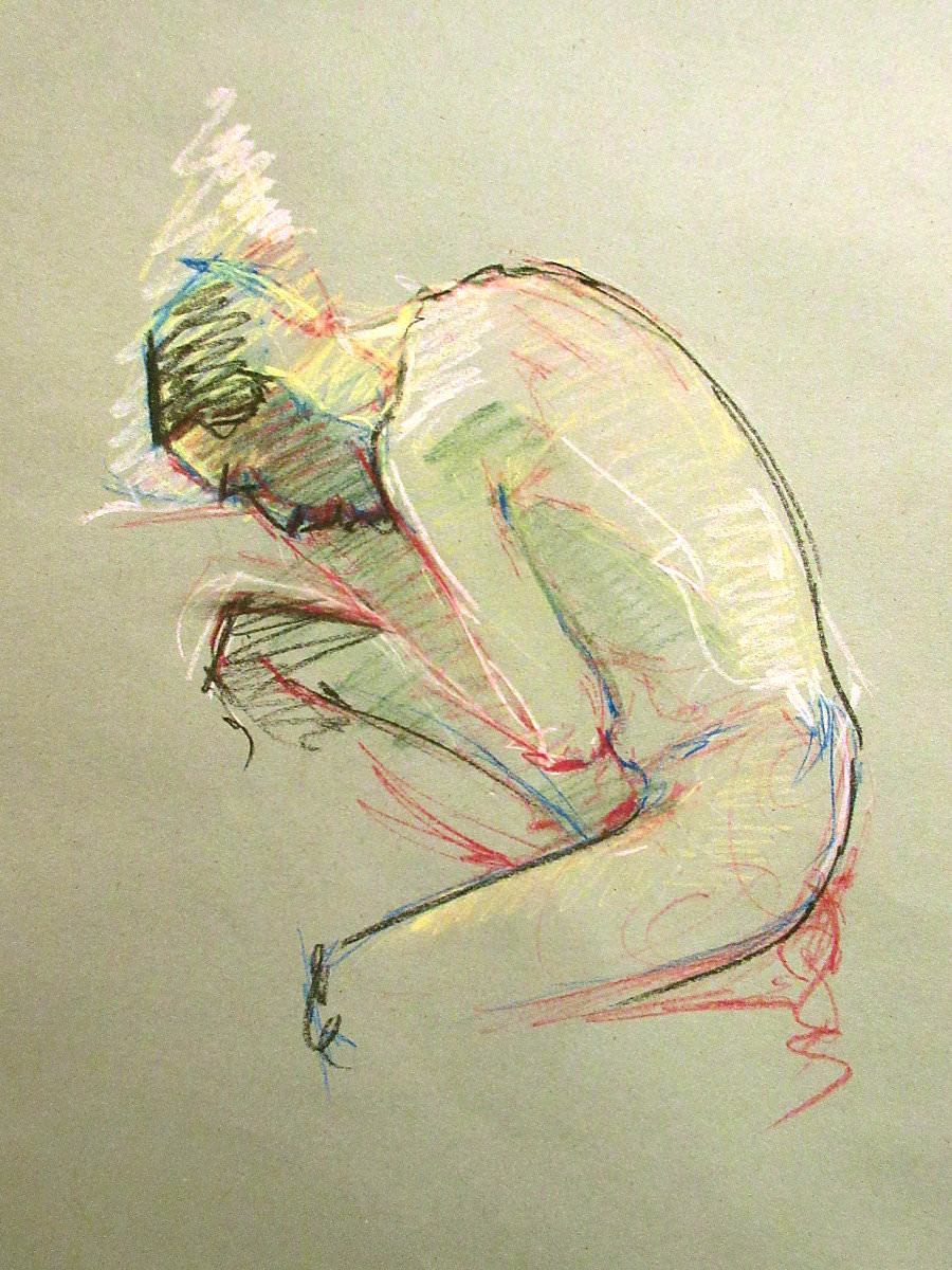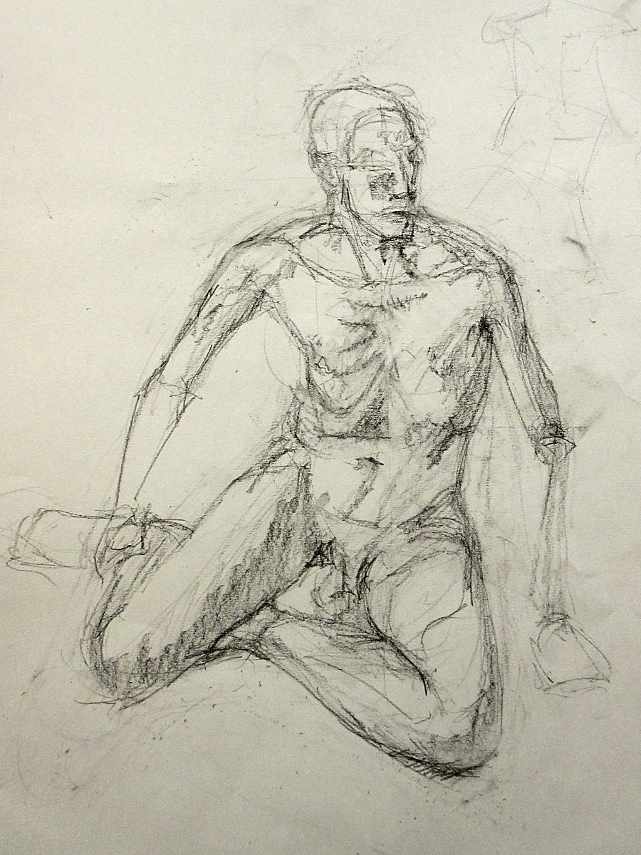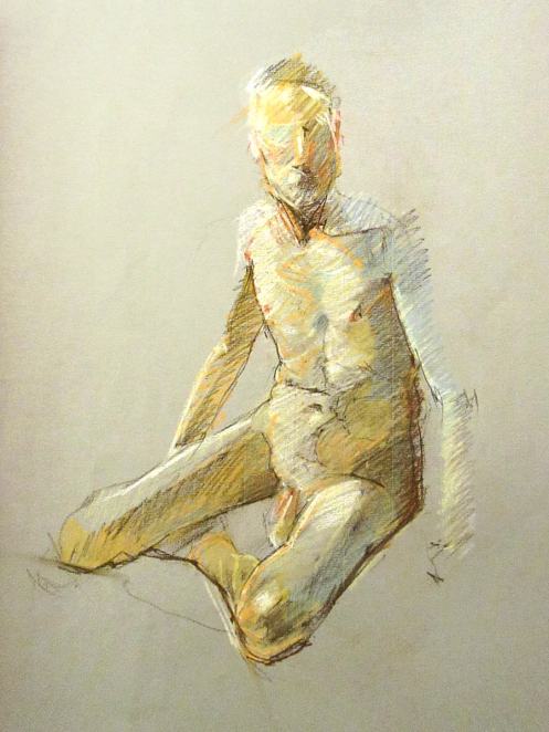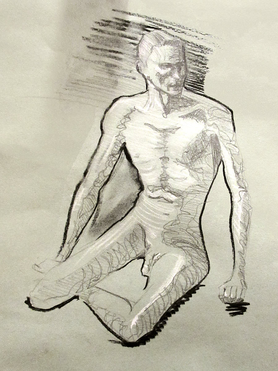 The place was clean, bright and spacious. Lighting had been specially rigged over the space where I was to work, easels stood in an arc and a table by one side was laden with complimentary materials. I began with four 2-minute warm-up poses, followed by 5-minutes inverted with my feet upon the back of a chair. After 15-minutes sitting with a twist, I was asked for 15-minutes squatting in a semi-balance on my toes. This was a real strain on the tendons, and required a break halfway – rare for a short pose.