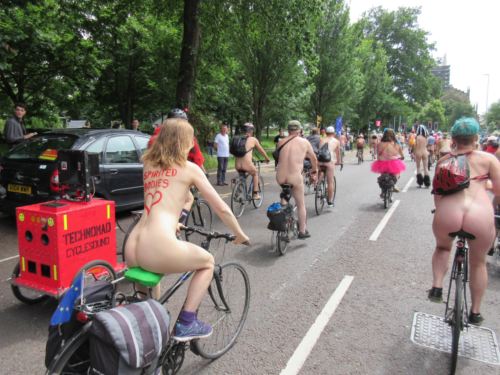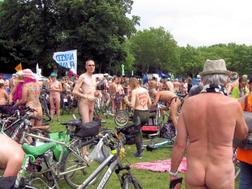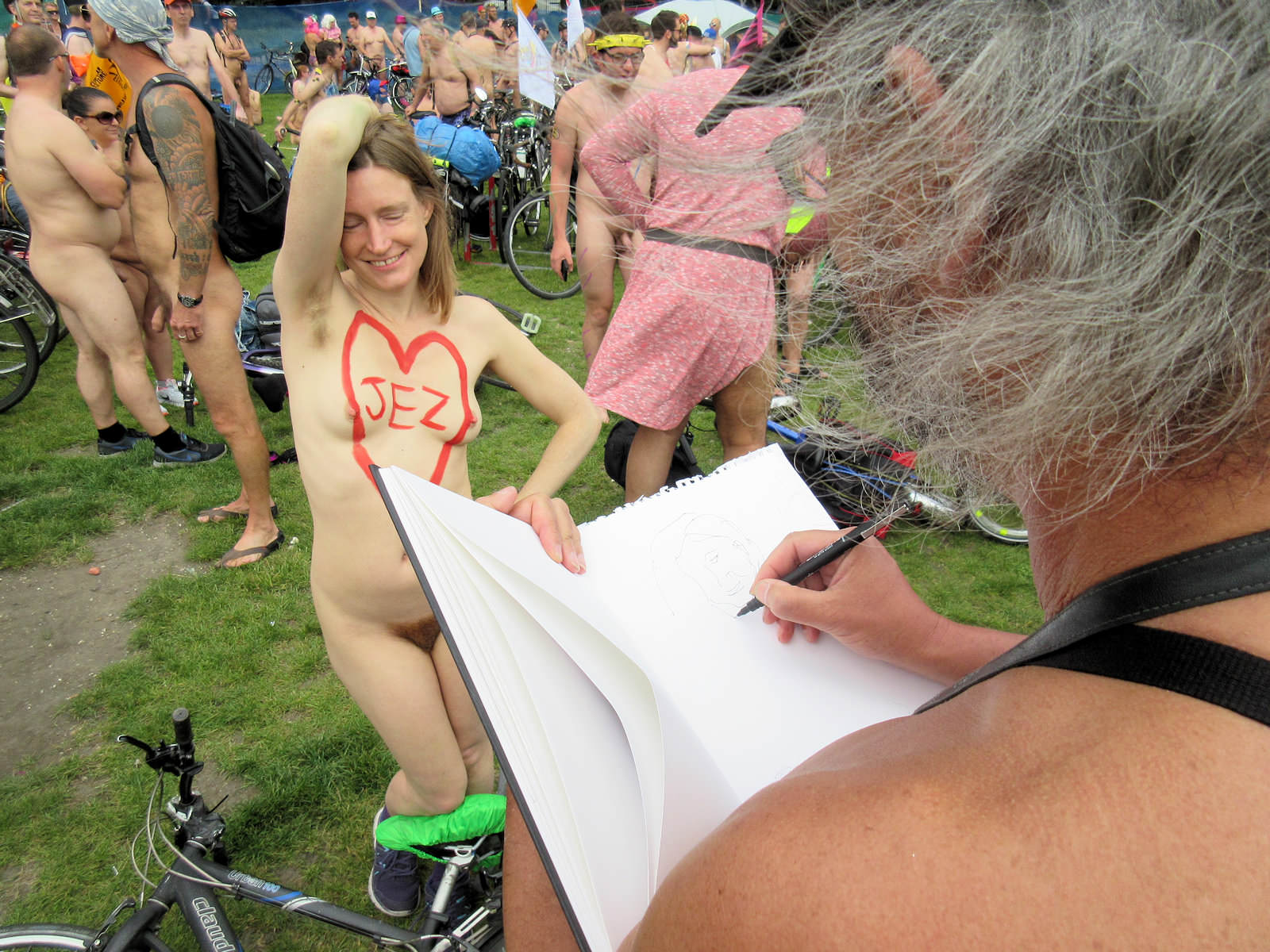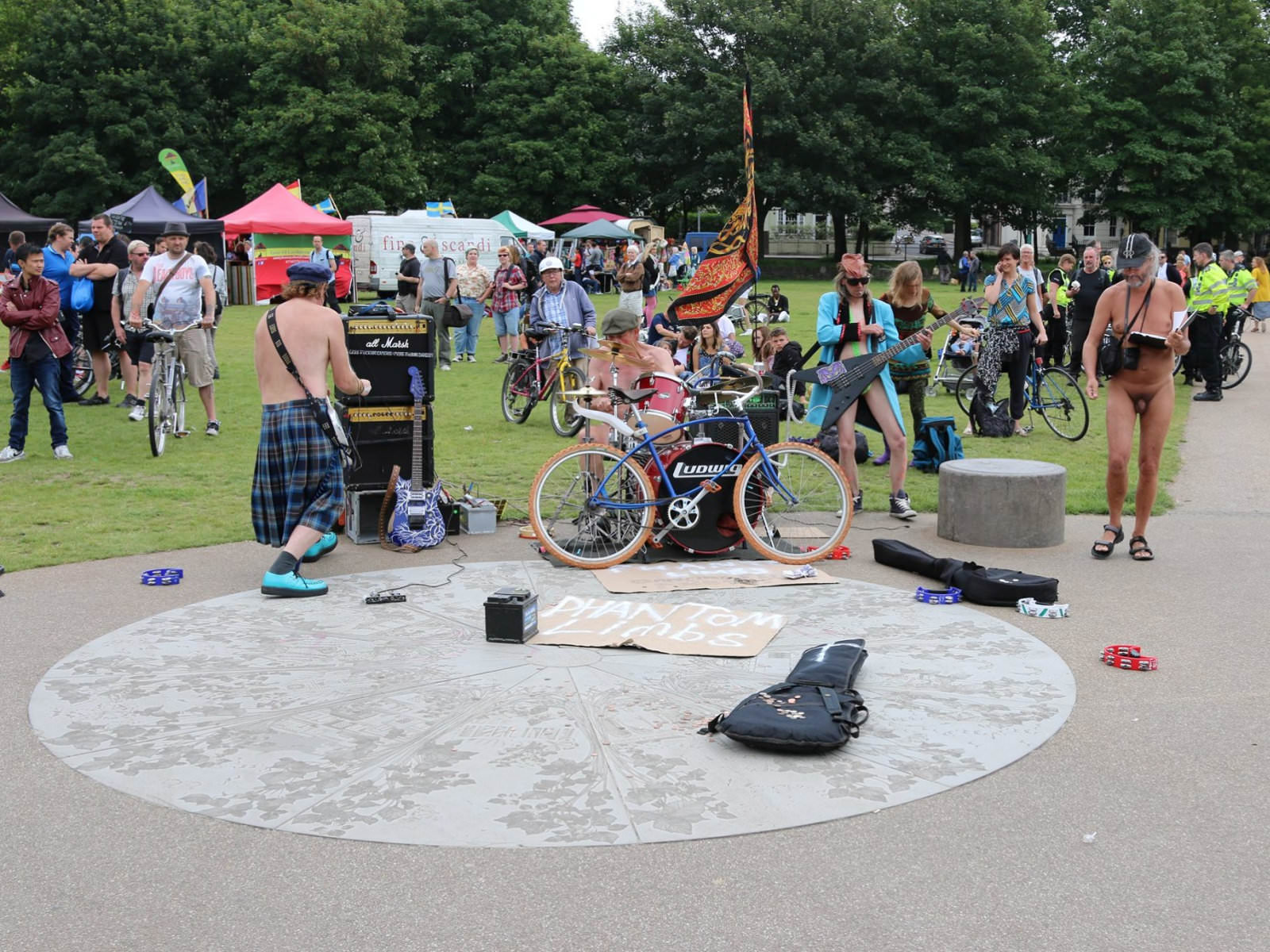 The ride was due to leave The Level at 1:30pm so we aimed to get there half an hour before. A discreet enclosure for bike ride participants was at the north end of the park but we found naked people roaming about freely elsewhere – not least our good friend Rodger, ready with his sketchpad for impromptu life drawing opportunities – whilst live skiffle-metal-reggae-punk was being rocked out by the semi-clad Phantom Limbs.