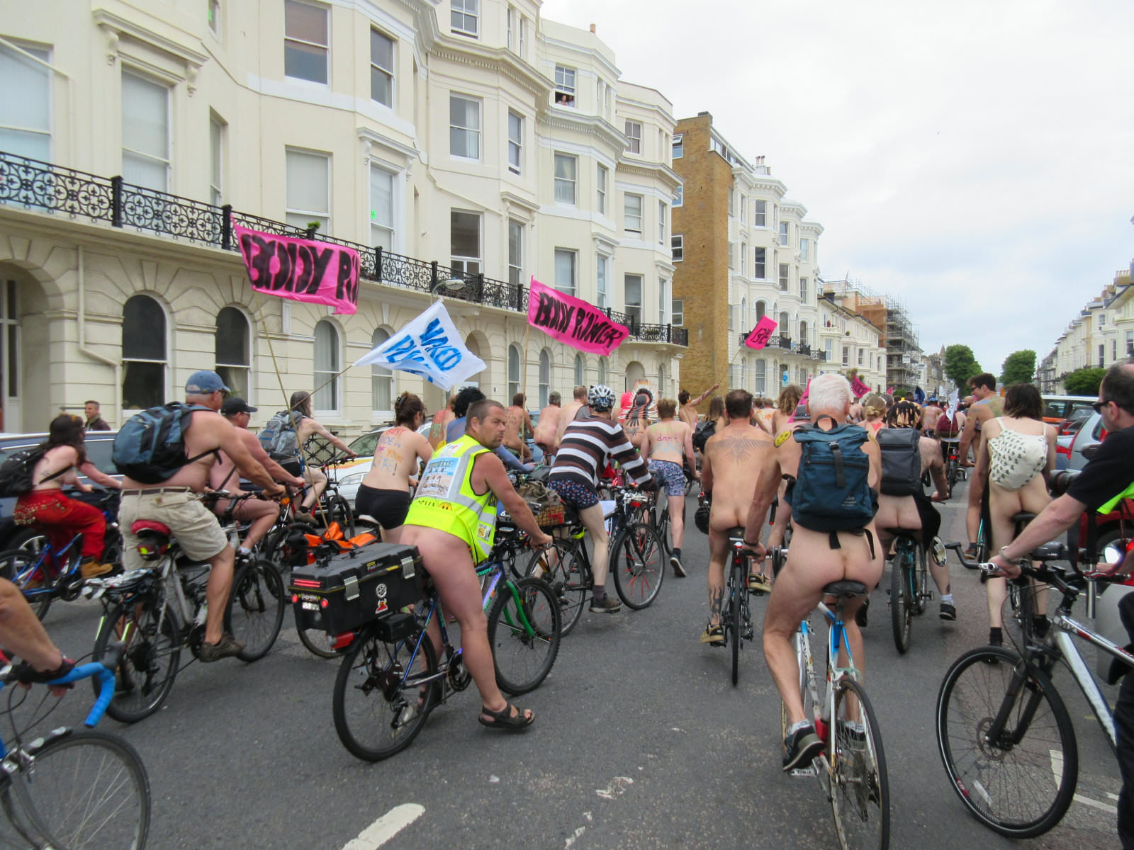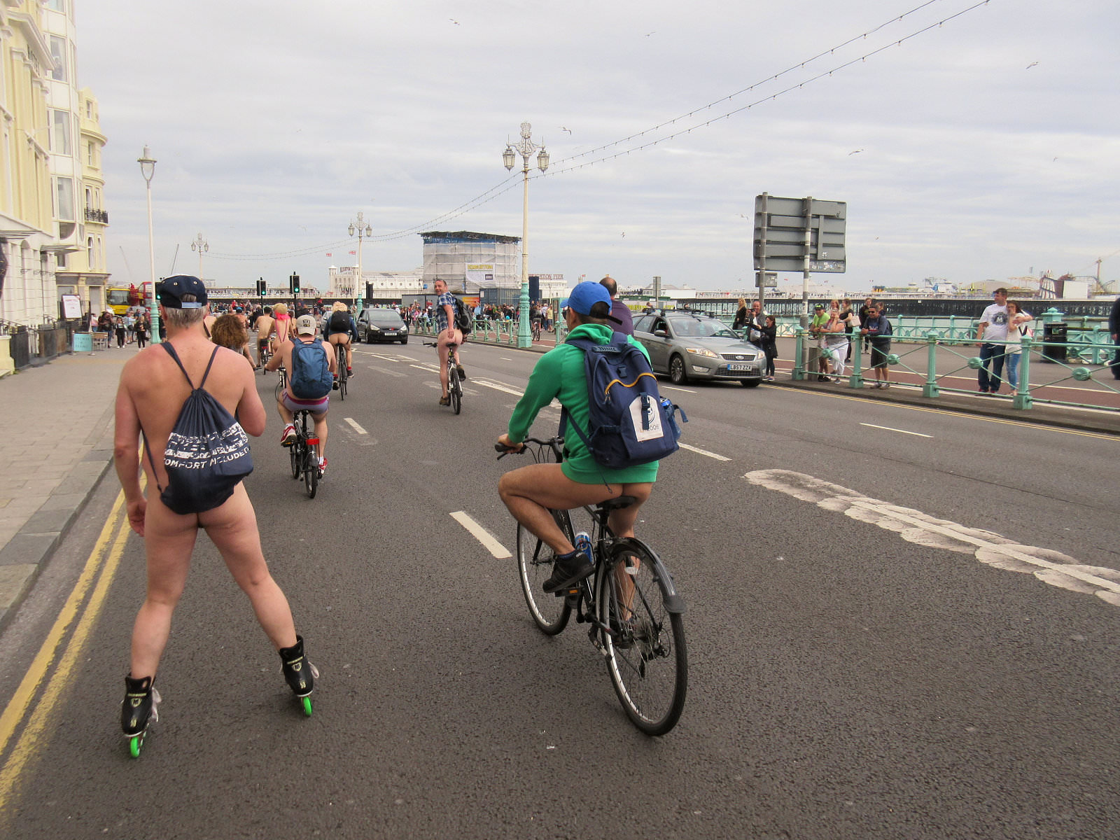 Since the earliest World Naked Bike Ride events in the UK, US and Netherlands on 12 June 2004, the phenomenon has spread to six continents and dozens of countries. The UK itself now has rides in more than twenty towns and cities yet, up to the end of last year, I had personally only participated in London. It was time to go further, so the day after London Naked Bike Ride 2017, Esther and I caught a train to Brighton.