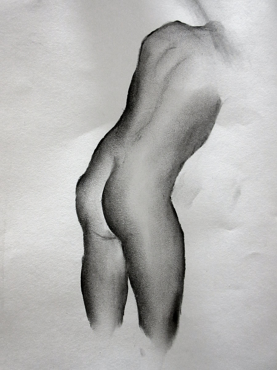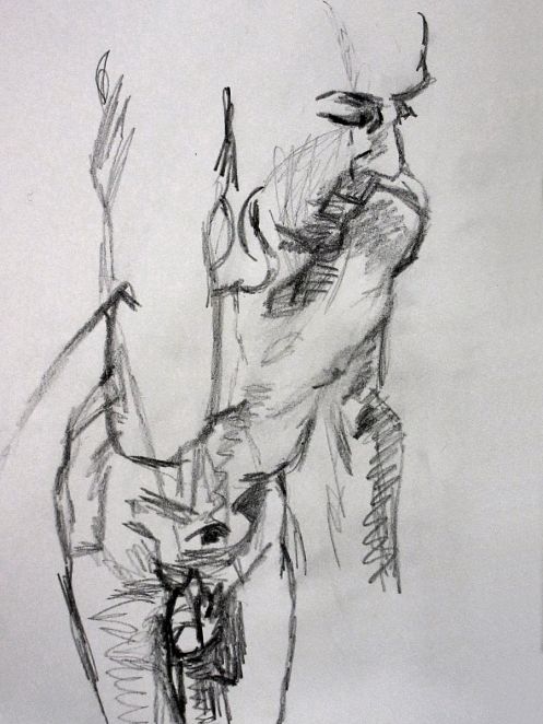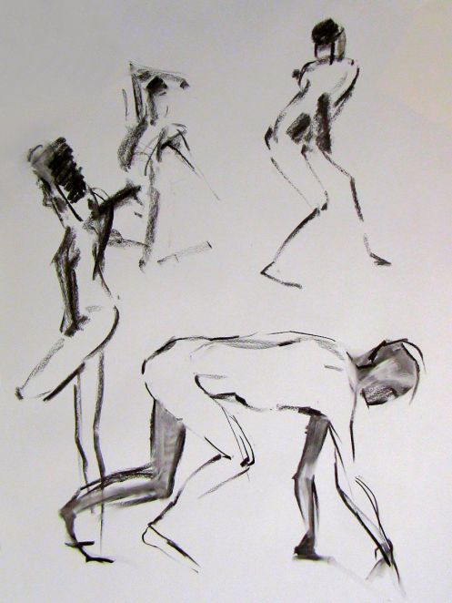 This was the last Monday evening life drawing session of term at The Conservatoire. Judging by the amount of sparkles on the floor of the life room, I guessed the previous class had been making Christmas decorations… though I’m not sure what accounted for the peculiar sandy texture underfoot. The broad square platform on which I usually work had gone missing, so I would begin upon a carpet of cushions and sheets in the round of easels, opening with three 1-minute poses.