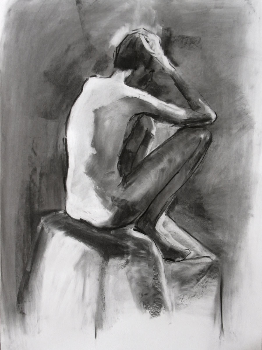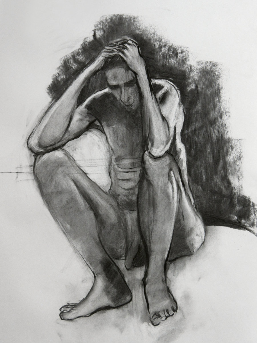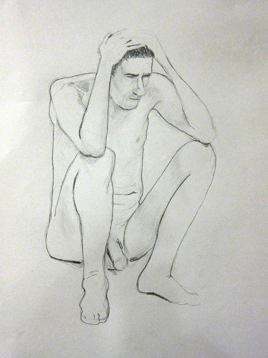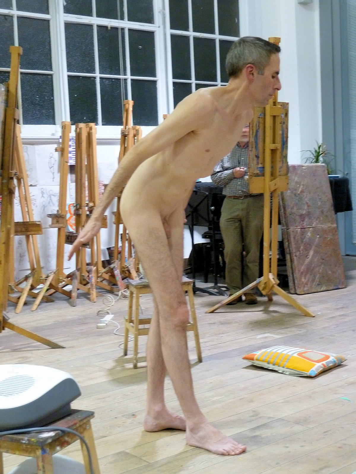Tutor Victoria Rance often favours getting me into poses that are either symmetrical or compact, or both. This one was all the above as I perched upon portable steps and a cubic box, with my heels near to my buttocks and hands with interlinking fingers on top of my head. I sat like this for four innings of 20-minutes each. It wasn’t particularly uncomfortable – numb fingers were my only affliction – but some great drawings were the result. It has been another very good term in a superb art space.