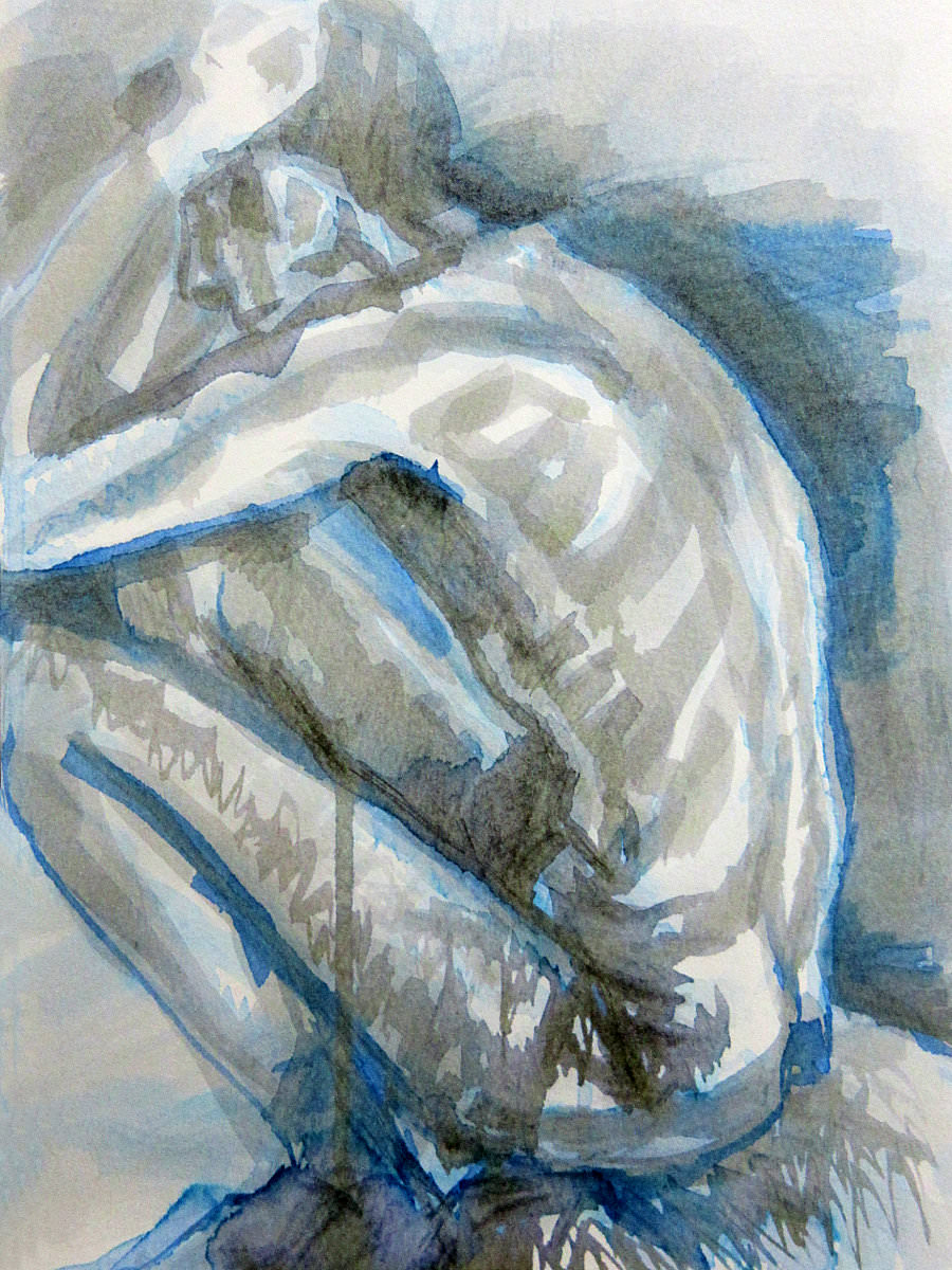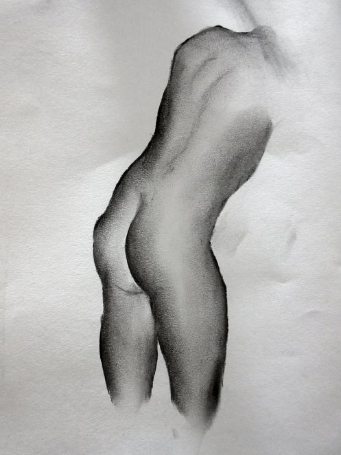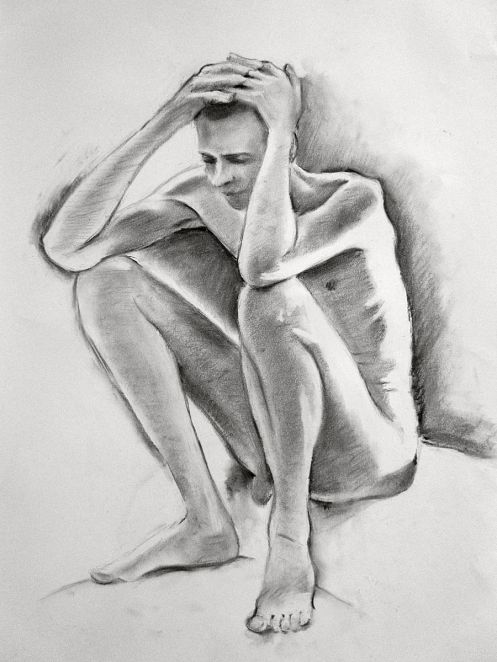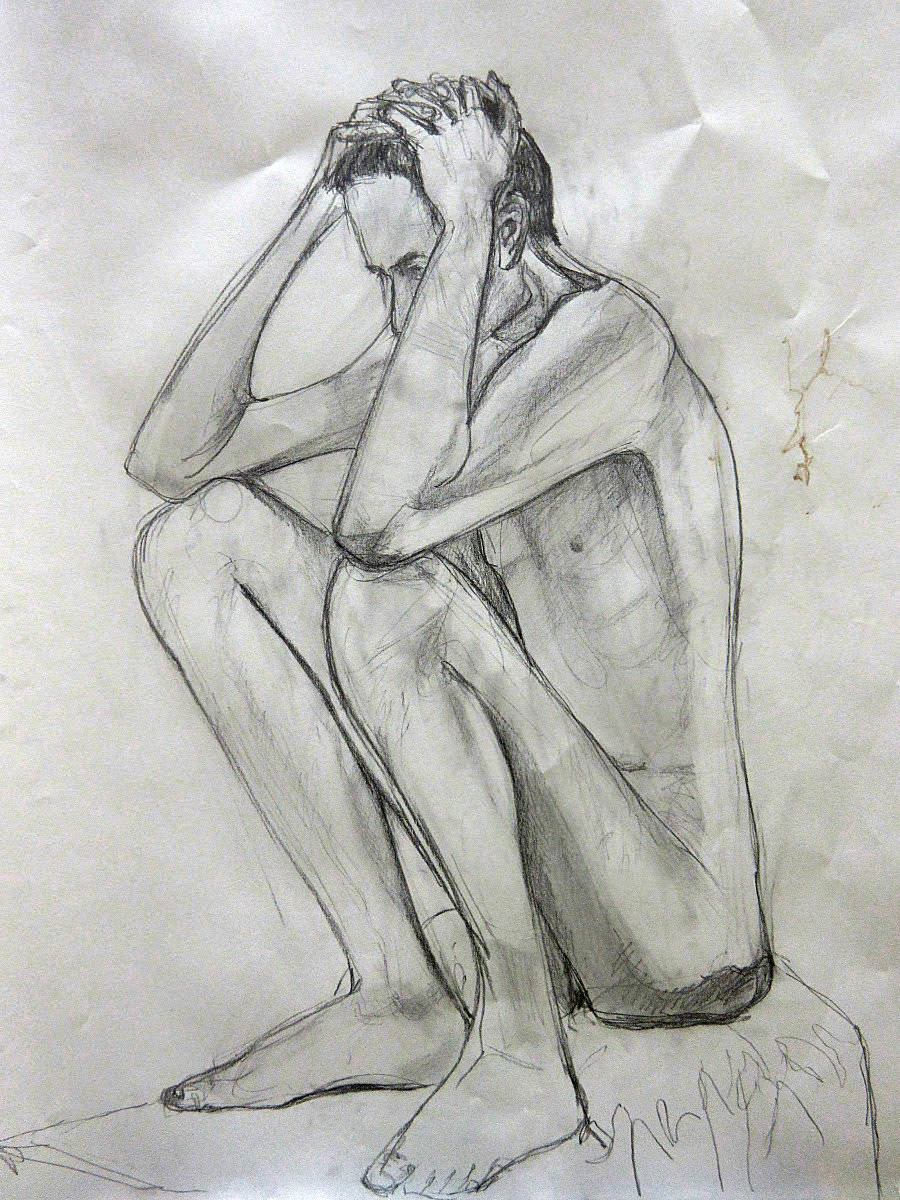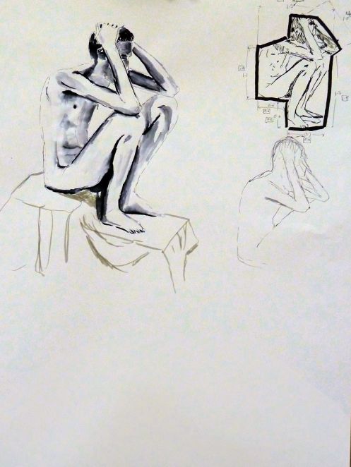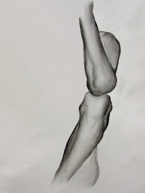 Tutor Victoria Rance often favours getting me into poses that are either symmetrical or compact, or both. This one was all the above as I perched upon portable steps and a cubic box, with my heels near to my buttocks and hands with interlinking fingers on top of my head. I sat like this for four innings of 20-minutes each. It wasn’t particularly uncomfortable – numb fingers were my only affliction – but some great drawings were the result. It has been another very good term in a superb art space.
