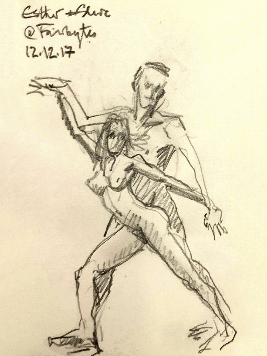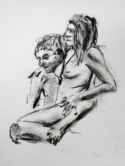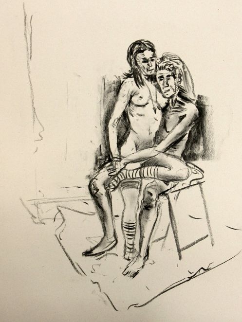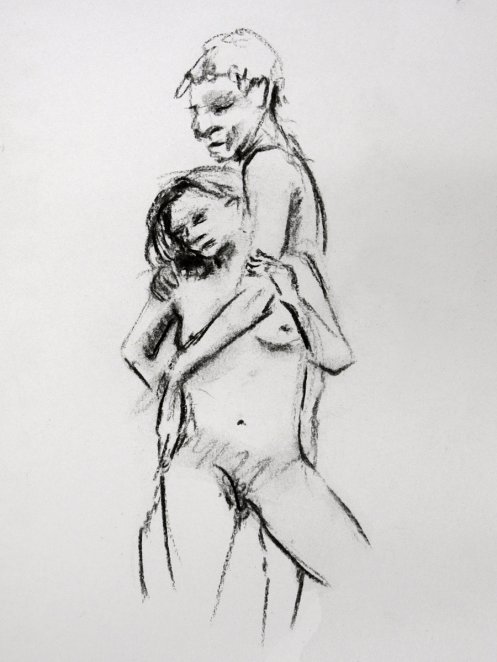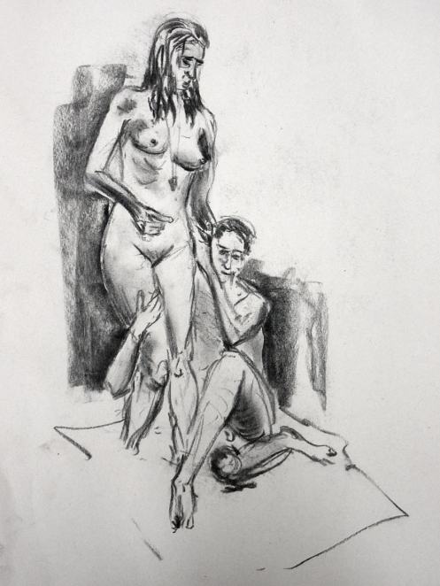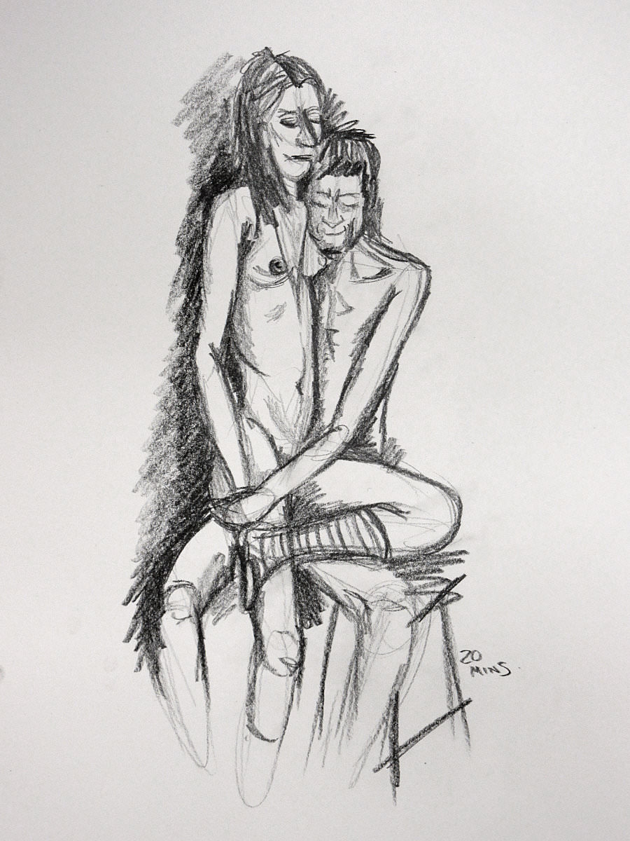 In the midst of it all we life modelled while our friend, Natansky and her sister, Estelle, called the times. We stood for 5-minutes and 10-minutes, then sat next to each other on chairs for 15-minutes. Closing the first half, Esther stood and I cuddled her hips for 13-minutes, up to the interval. After tea, coffees and snacks we sat in an embrace on the floor for 20-minutes, and finally Esther stood leaning both upon and across me for the last (sometimes achy) 25-minutes. We enjoyed our time here, and hope everyone else felt the same way. I do like a group with character!