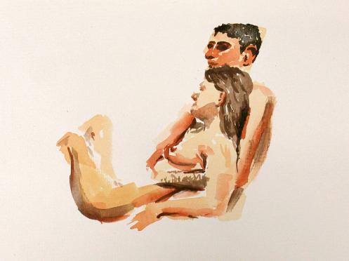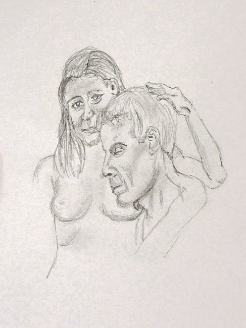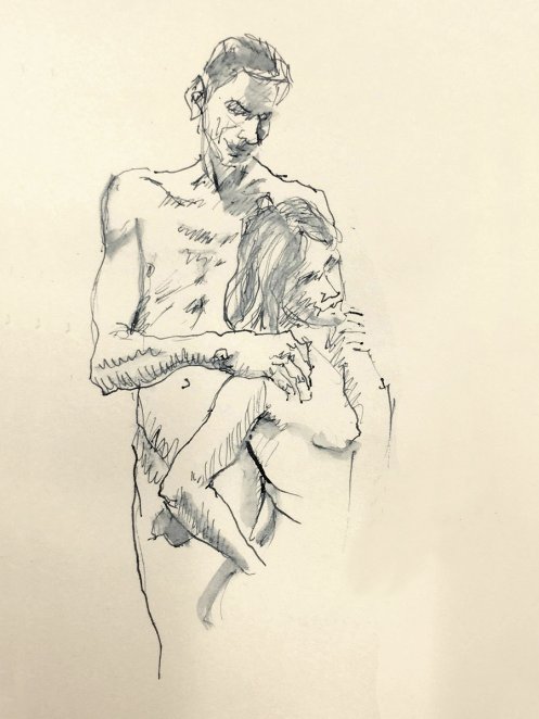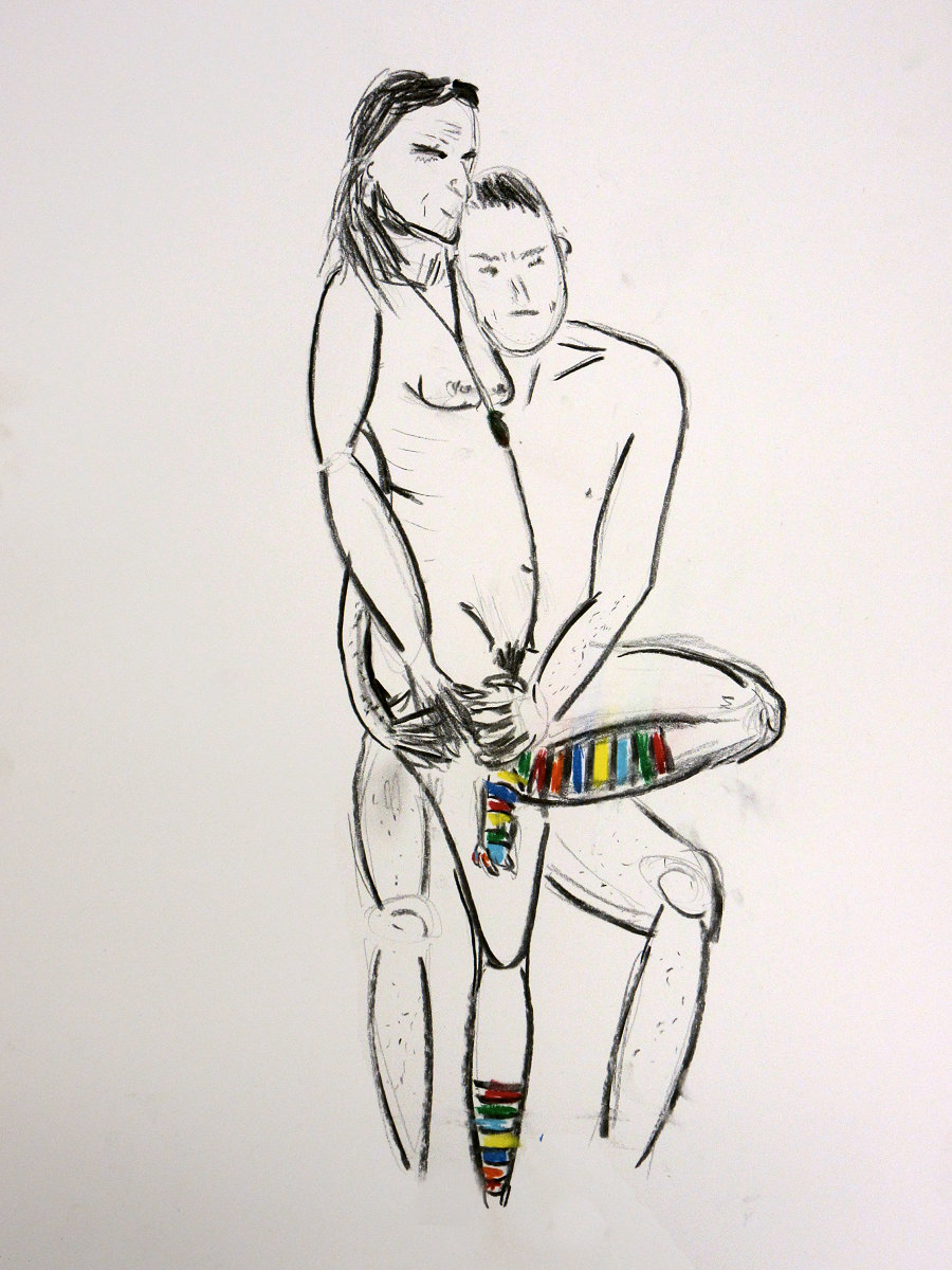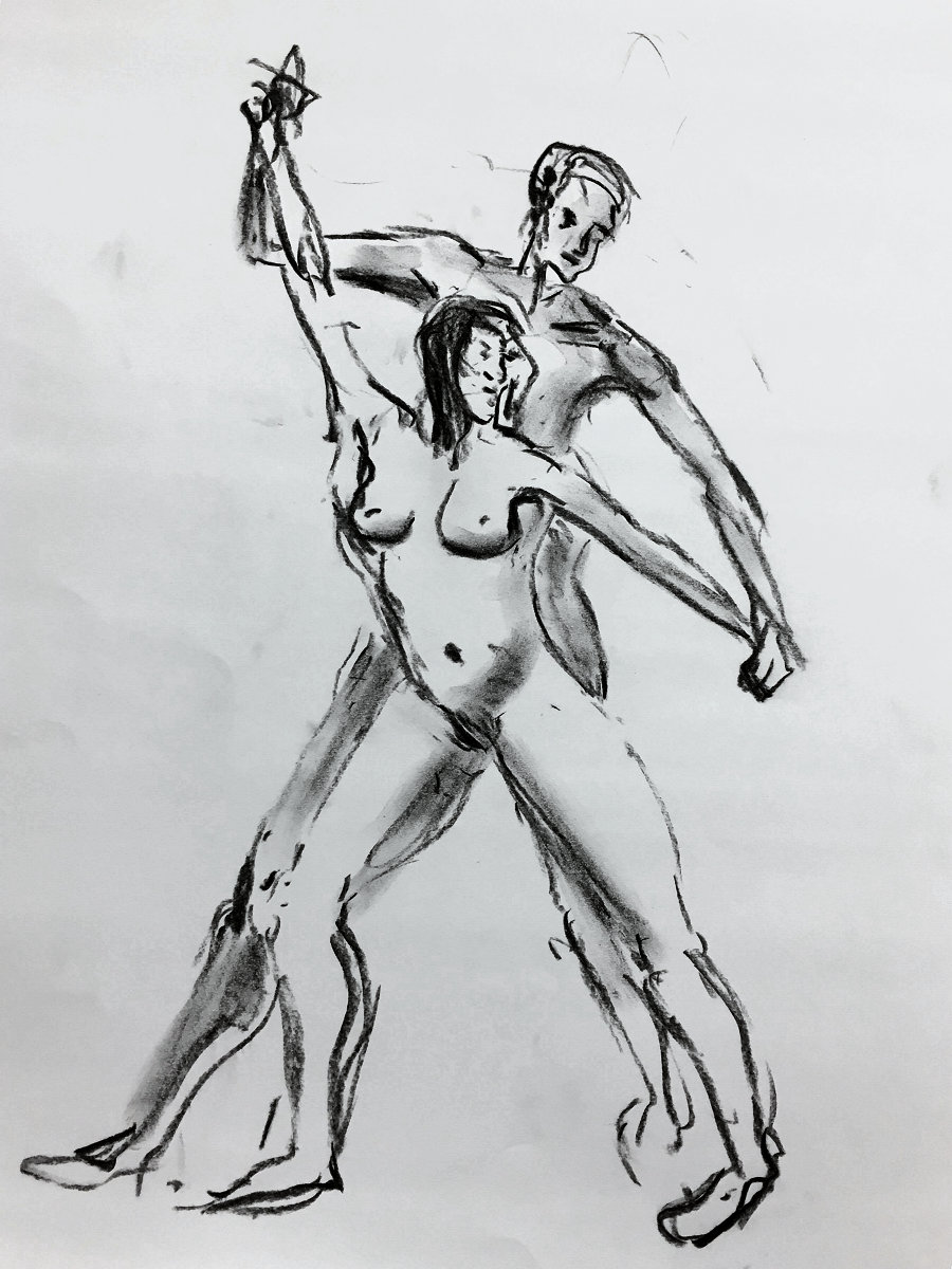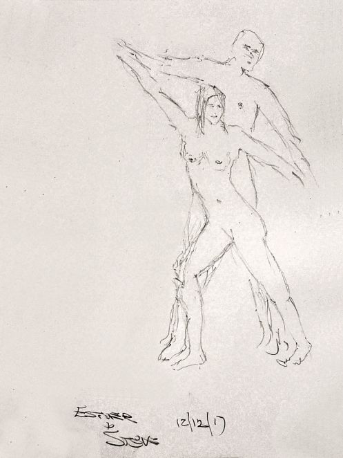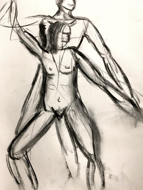 In the midst of it all we life modelled while our friend, Natansky and her sister, Estelle, called the times. We stood for 5-minutes and 10-minutes, then sat next to each other on chairs for 15-minutes. Closing the first half, Esther stood and I cuddled her hips for 13-minutes, up to the interval. After tea, coffees and snacks we sat in an embrace on the floor for 20-minutes, and finally Esther stood leaning both upon and across me for the last (sometimes achy) 25-minutes. We enjoyed our time here, and hope everyone else felt the same way. I do like a group with character!