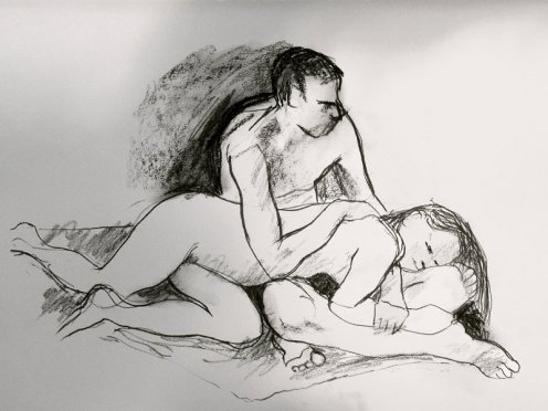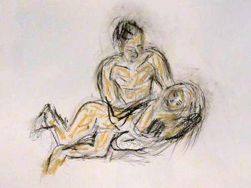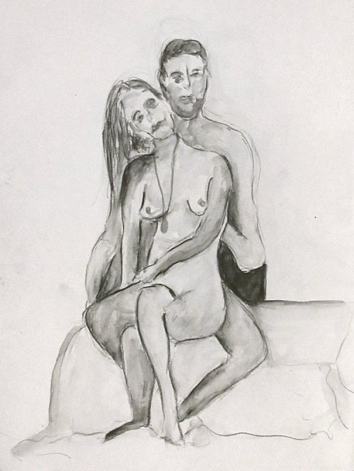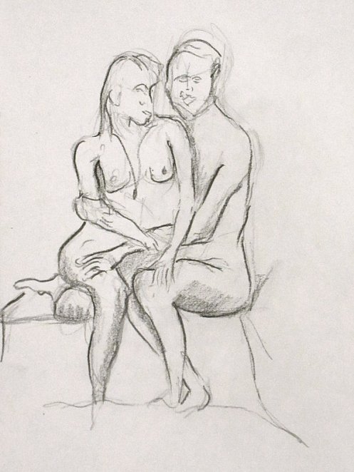 “No hands!” was the plea as we readied to pose after the break. Therein lies the prime challenge for artists drawing duo life models: two models, two faces, four hands, eight limbs… and if the duo is me and Esther, there is going to be quite a bit of intertwining. So, as a kindness to the suffering artists at cave in Pimlico, when we resumed with a seated pose, we attempted to conceal our hands. Having two models was intended to be a Christmas treat, yet at times it may have felt more like a torment…