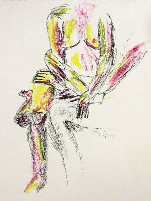 It was a merry little session as befitted our last life modelling, and the group’s last life drawing, of 2017. Group organiser, Karen had put lashing of gorgeous mulled wine on simmer, with a couple of full Irish cream liqueur bottles on the side and the ubiquitous plate of mince pies. Only occasional despairing sighs from artists struggling with their works was out of keeping with ambient festiveness, but for models it is a positive sign of their desire to do us justice.